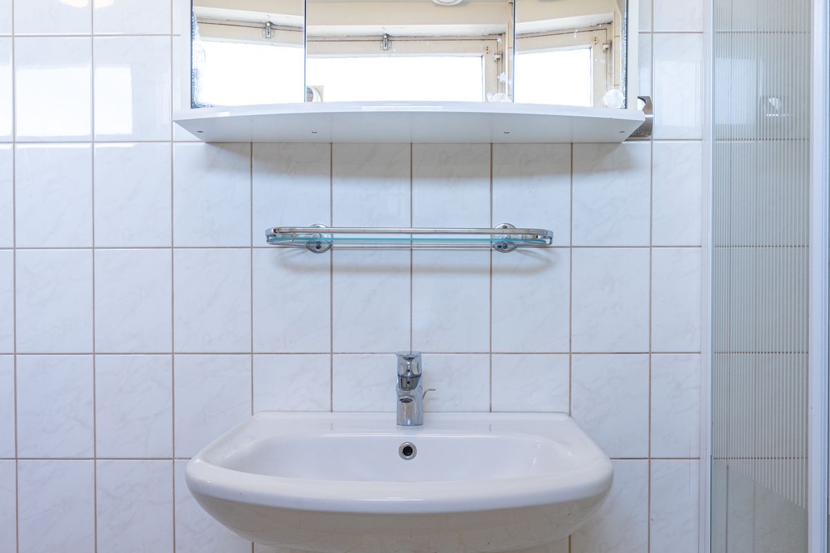 De badkamer is volledig betegeld en functioneel ingedeeld, met alles wat je nodig hebt op één plek. Er is een wastafel met spiegel en verlichting, een douche met glazen deur, een toilet, radiator en een aansluiting voor de wasmachine. Dankzij het raam is er natuurlijke ventilatie en daglicht, wat de ruimte fris en comfortabel houdt.