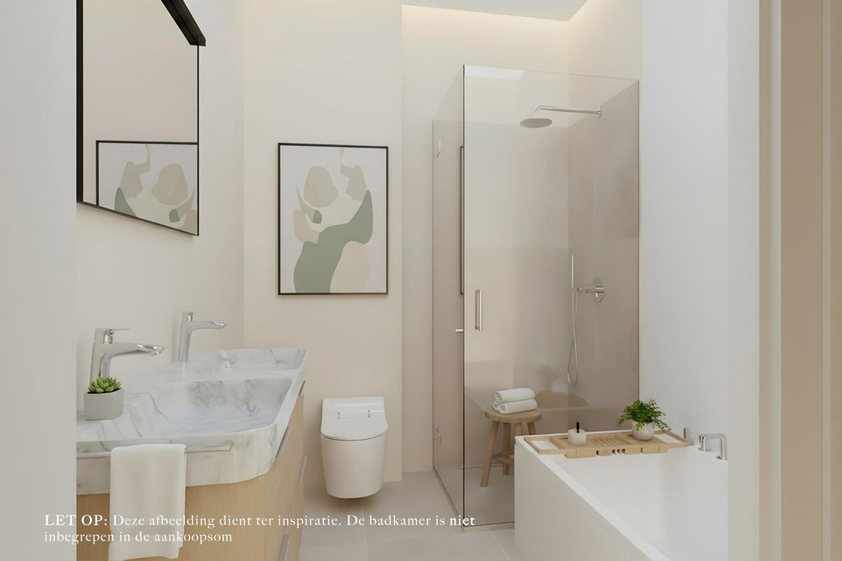 De badkamer van ca. 5,9 m² biedt volop mogelijkheden om een comfortabele en stijlvolle badkamer te realiseren, volledig naar eigen wens. In de aankoopsom is reeds een basis badkamer opgenomen inclusief betegeling, inloopdouche en wasbak. De opgenomen sfeerimpressie in de fotoreeks is opgenomen ter inspiratie van de mogelijkheden.