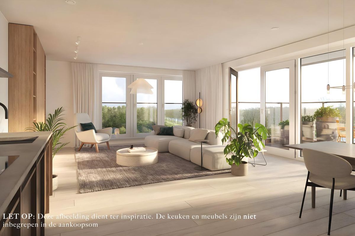 Aan het einde van de hal loop je door naar de royale living met open keuken, samen ca. 44 m². Dankzij de grote raampartijen en de vrije ligging komt het daglicht van meerdere kanten binnen en voelt deze ruimte als een heerlijke plek om te leven, te koken en samen te zijn. Hier is voldoende plek voor een grote eettafel én een comfortabele zithoek. De deur naar het balkon van ca. 9,4 m² verbindt de living op slimme wijze met de buitenruimte, waardoor binnen en buiten mooi in elkaar overlopen. Het balkon is een fijne plek om in alle rust van het fenomenale uitzicht en de buitenlucht te genieten.