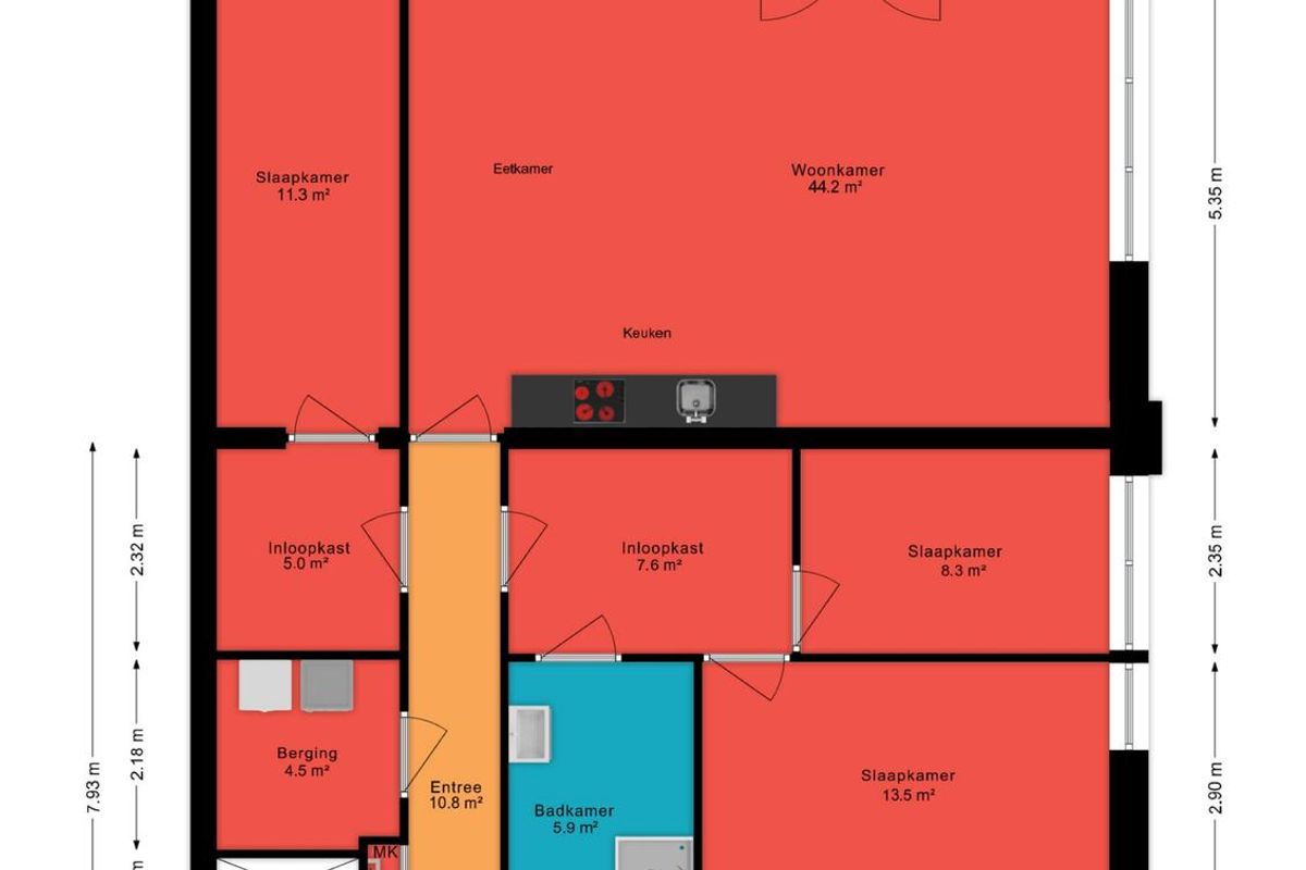 De drie royale slaapkamers variëren in grootte van ca. 8,3 m² tot 13,5 m² en zijn stuk voor stuk goed in te delen. Wat deze woning écht bijzonder maakt, is dat elke slaapkamer direct toegankelijk is via een ruime inloopkast/doorloopkamer. Dit betekent dat er geen extra kasten nodig zijn: al uw kleding en persoonlijke spullen zijn keurig opgeruimd en binnen handbereik, terwijl de slaapkamers zelf een gevoel van rust, ruimte en luxe uitstralen. Een slimme en comfortabele indeling die een ongekend hoog wooncomfort biedt.