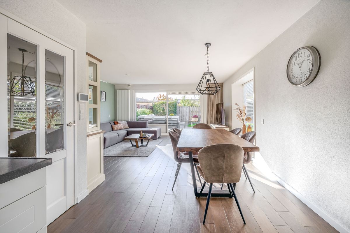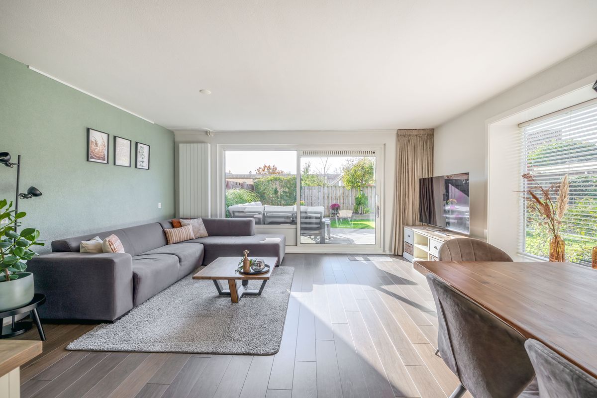 De woonkamer is tuingericht en heeft een oppervlakte van circa 29 m². Ook hier zijn de wanden afgewerkt met spachtelputz en het plafond met spuitwerk. Bij binnenkomst valt meteen de hoeveelheid daglicht op! Dat komt door het grote zijraam in combinatie met de brede schuifpui aan de achterzijde. En niet onbelangrijk: vanuit de woonkamer heb je een leuk uitzicht op zowel de zij- als de achtertuin.