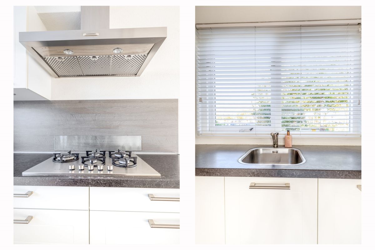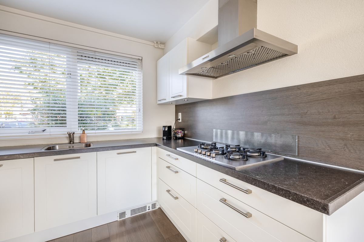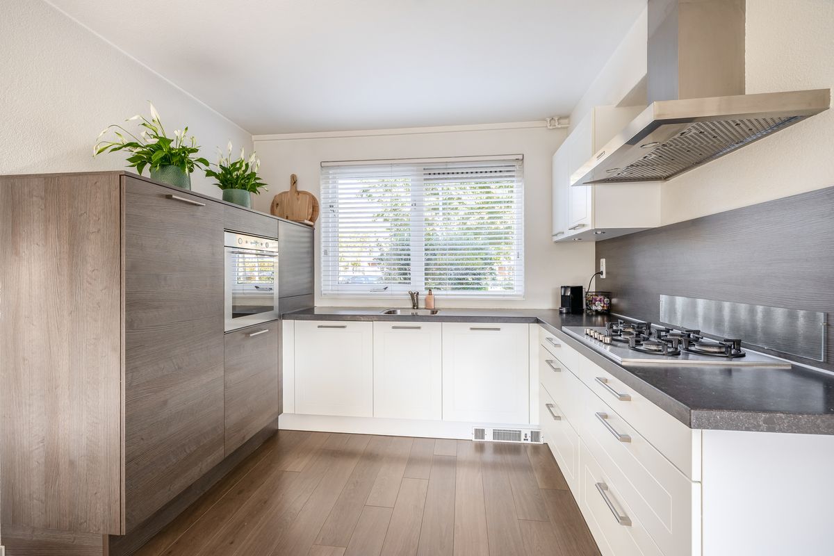 De woonkamer staat in open verbinding met de keuken. De keuken is geplaatst in een ruime L-vormige opstelling en is uitgerust met diverse inbouwapparatuur, waaronder een 5-pits kookplaat met afzuigkap, oven, vaatwasser en koel-/vriescombinatie. Vanuit de keuken heb je bovendien een prettig uitzicht over de straat en de singel.
