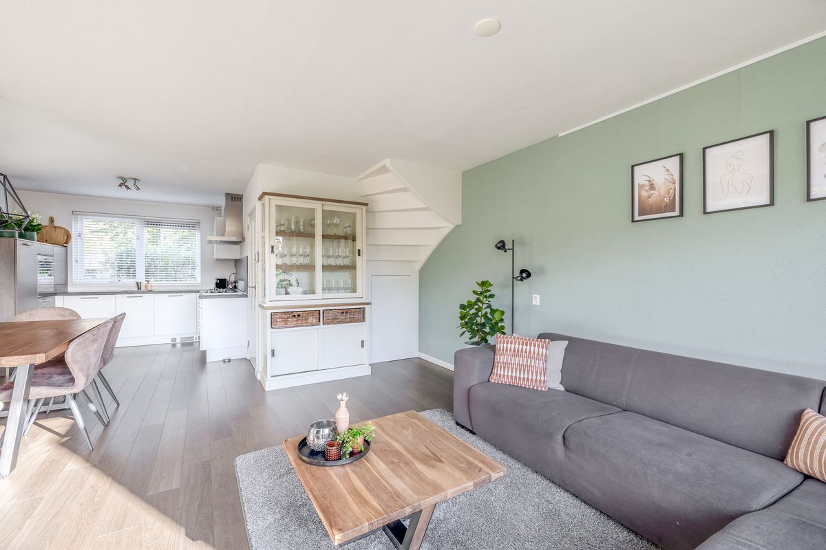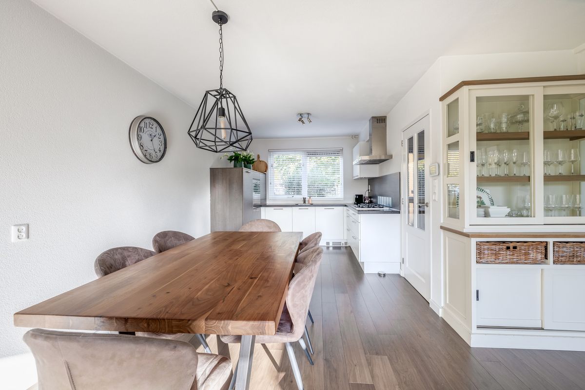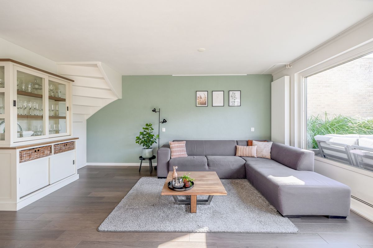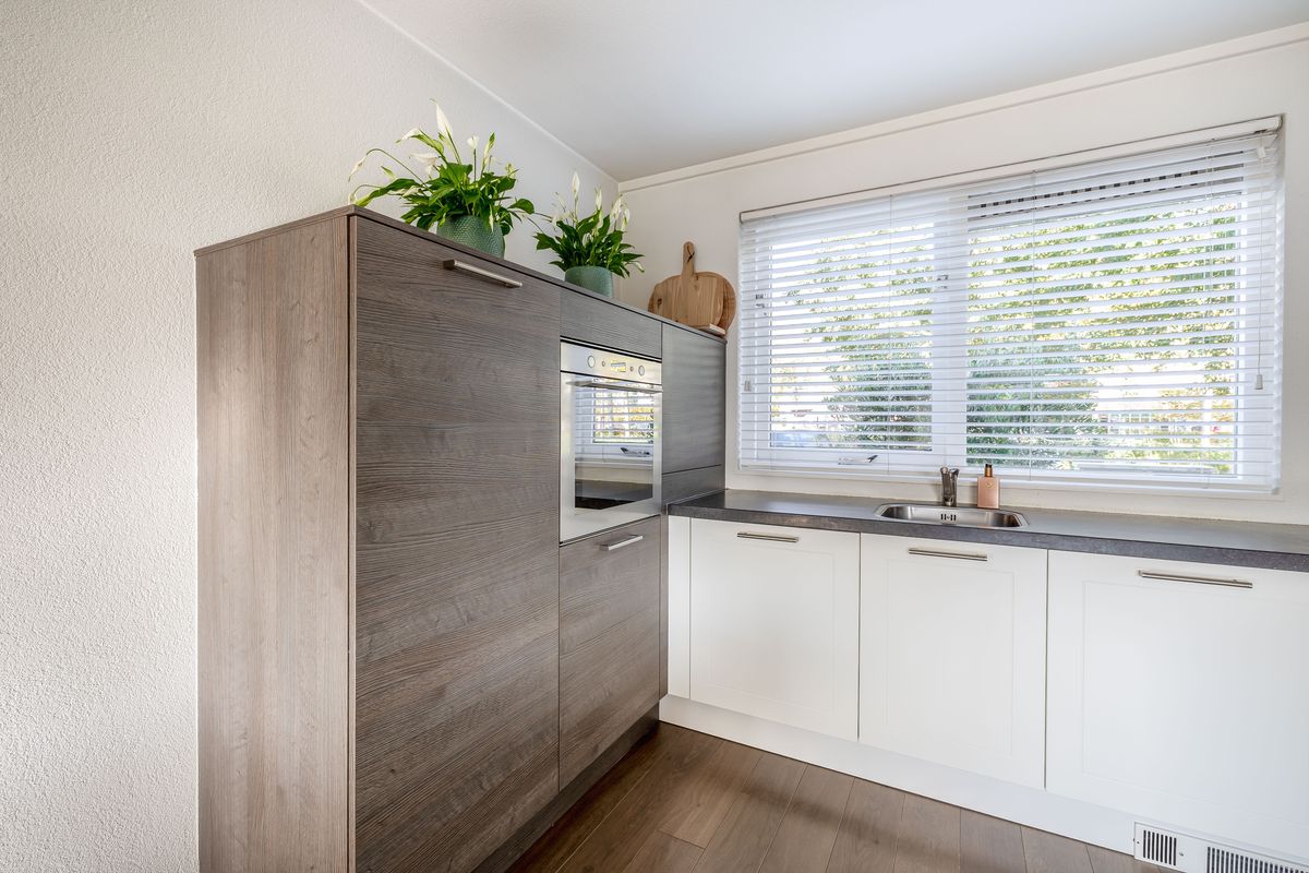 De woonkamer staat in open verbinding met de keuken. De keuken is geplaatst in een ruime L-vormige opstelling en is uitgerust met diverse inbouwapparatuur, waaronder een 5-pits kookplaat met afzuigkap, oven, vaatwasser en koel-/vriescombinatie. Vanuit de keuken heb je bovendien een prettig uitzicht over de straat en de singel.