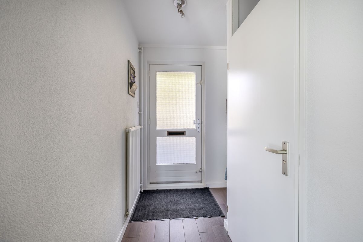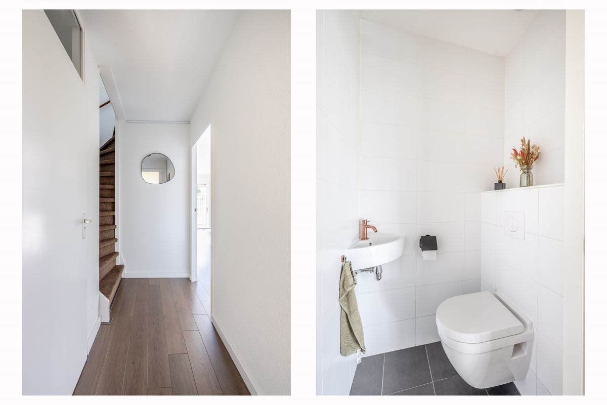 Als je de woning binnenstapt, kom je eerst in de hal. Hier vind je de meterkast (modern uitgevoerd met 12 groepen), het toilet en de trapopgang naar de eerste verdieping. De hal en de gehele trapopgang tot aan de zolder zijn afgewerkt met spachtelputz op de wanden. De trappen zijn netjes bekleed en het plafond is voorzien van spuitwerk. De hele begane grond is afgewerkt met een keurige laminaatvloer. Het toilet is vernieuwd en voorzien van een vrijhangend closet en een fonteintje.
