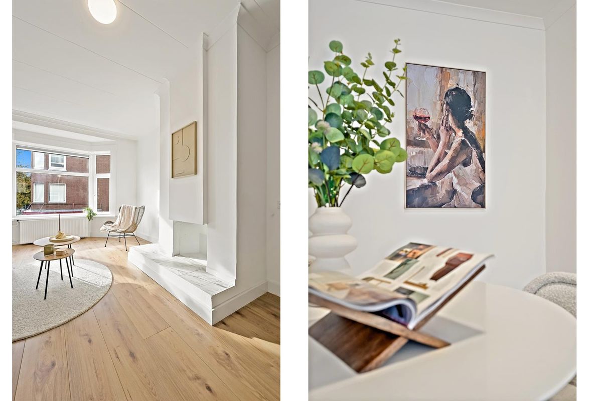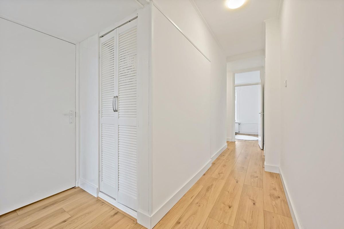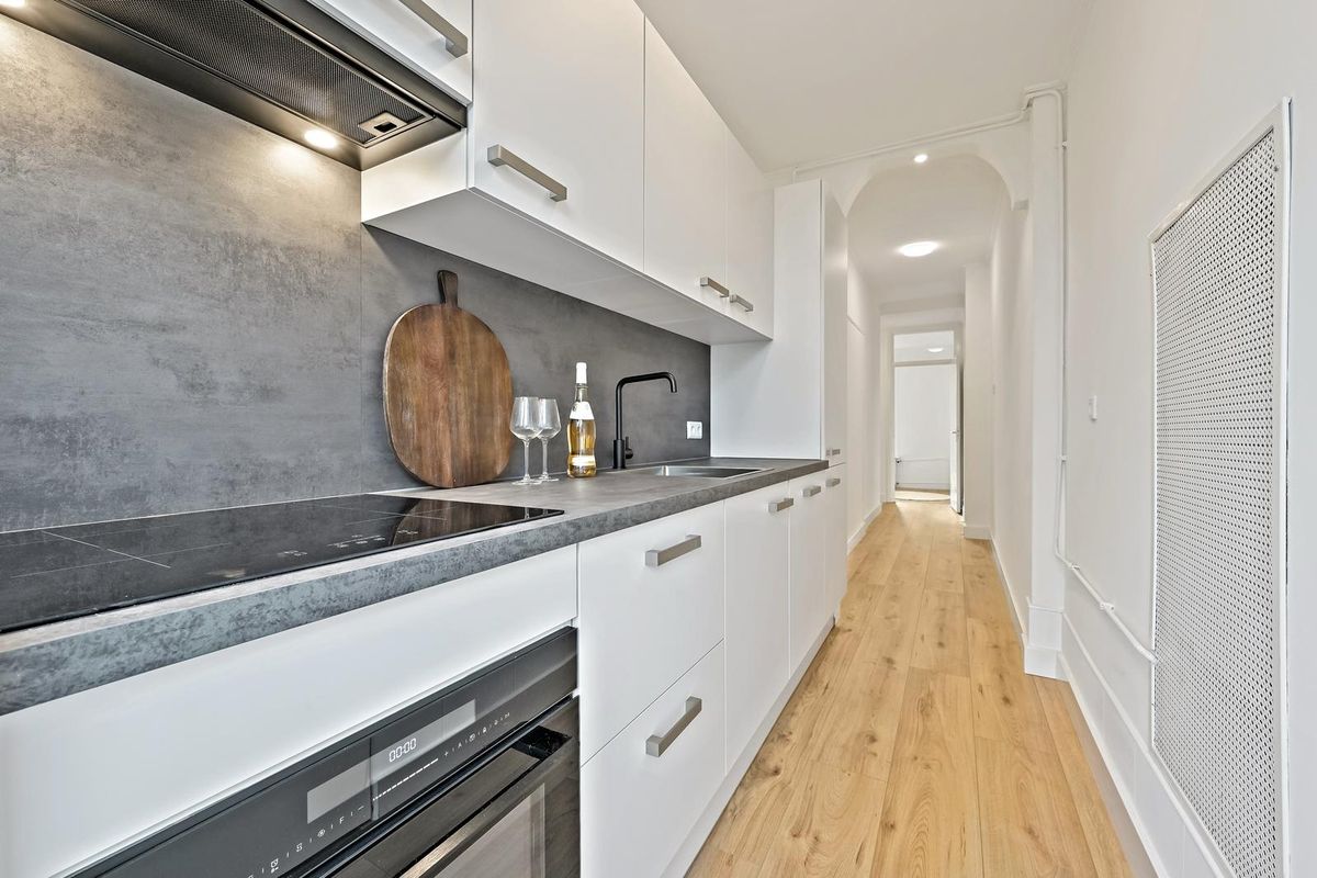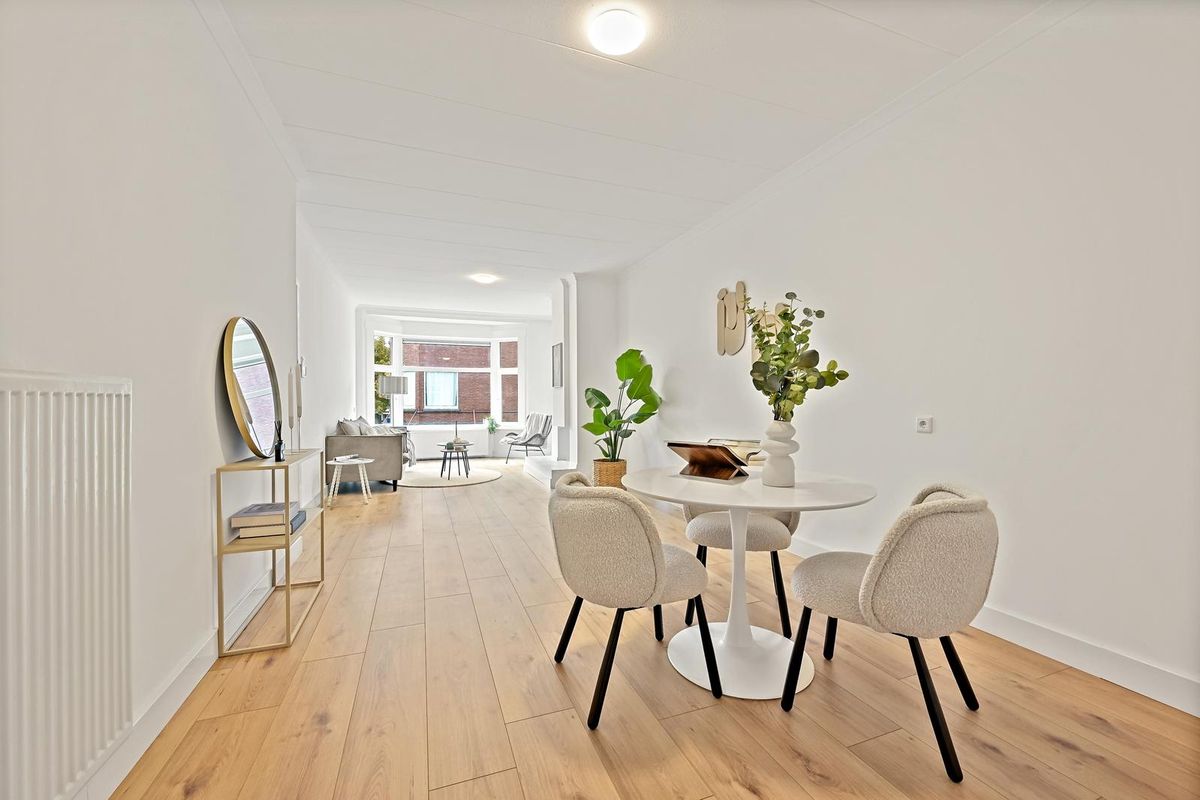 Typical Hague portico leading to the first floor. Entrance to the apartment with spacious storage area and meter cupboard (smart meter), as well as a separate toilet. The first bedroom is located at the front and overlooks the square. The bright and spacious living/dining room features a decorative mantelpiece and charming bay window. At the rear you will find the brand-new kitchen, equipped with a fridge-freezer combination, induction hob, dishwasher and extractor. The kitchen provides access both to the bathroom—featuring a bathtub, shower cabin and washbasin with vanity unit—and to the balcony with views over the courtyard gardens. The second bedroom is also located at the rear.