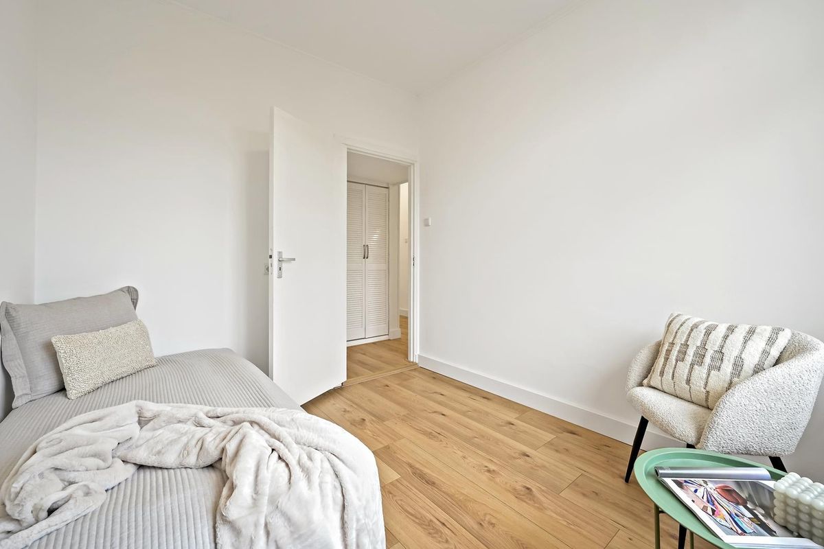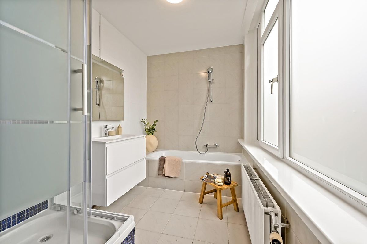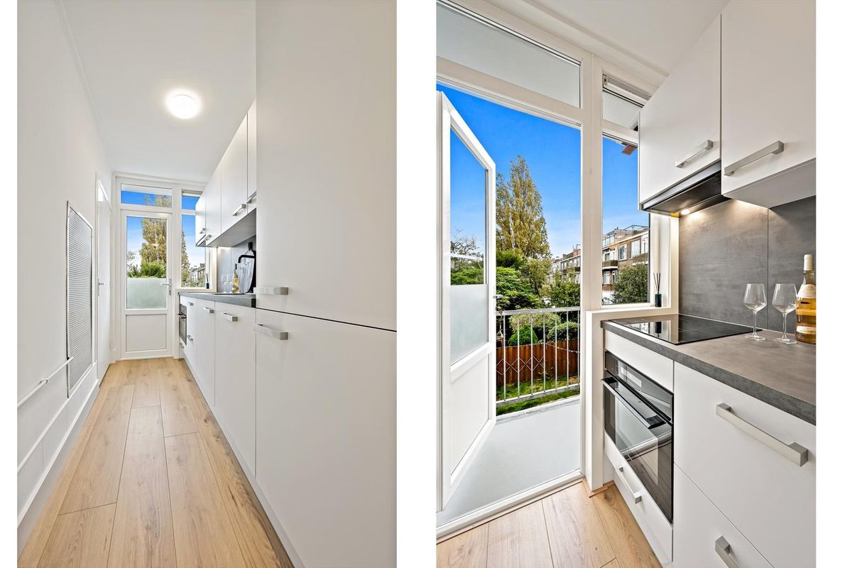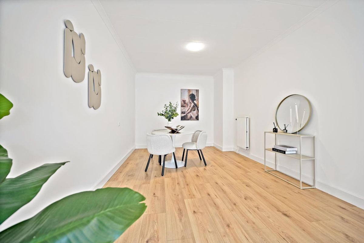Typical Hague portico leading to the first floor. Entrance to the apartment with spacious storage area and meter cupboard (smart meter), as well as a separate toilet. The first bedroom is located at the front and overlooks the square. The bright and spacious living/dining room features a decorative mantelpiece and charming bay window. At the rear you will find the brand-new kitchen, equipped with a fridge-freezer combination, induction hob, dishwasher and extractor. The kitchen provides access both to the bathroom—featuring a bathtub, shower cabin and washbasin with vanity unit—and to the balcony with views over the courtyard gardens. The second bedroom is also located at the rear.