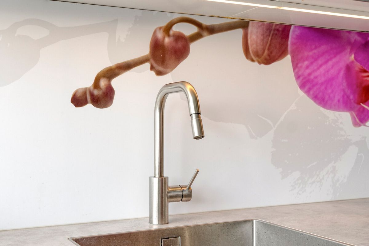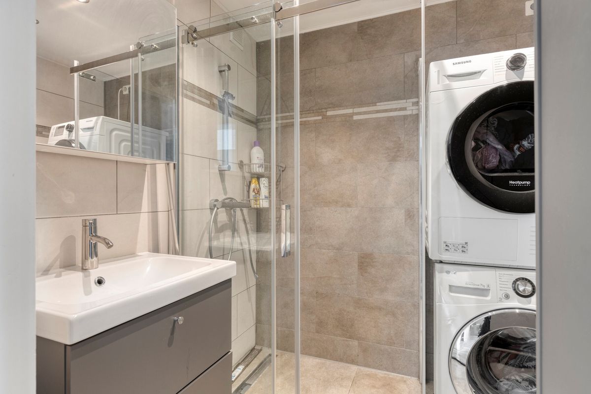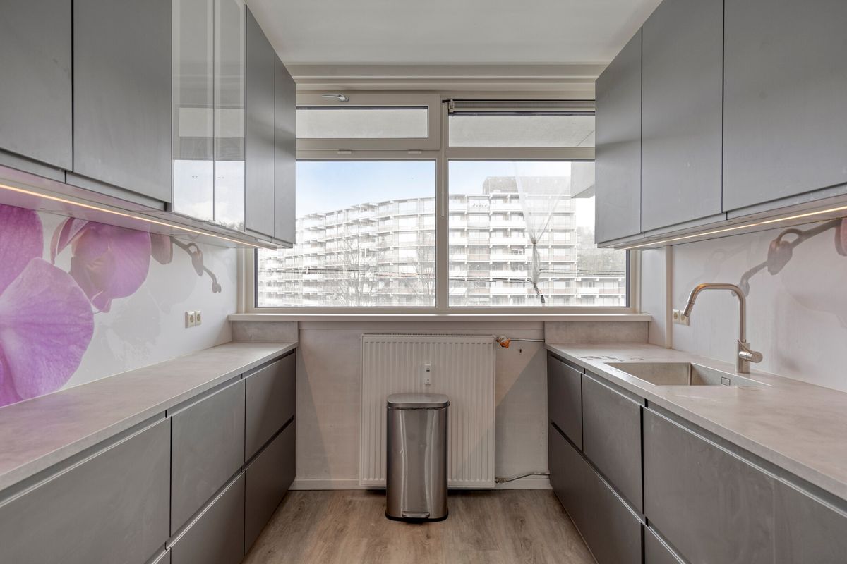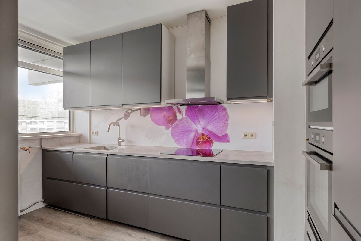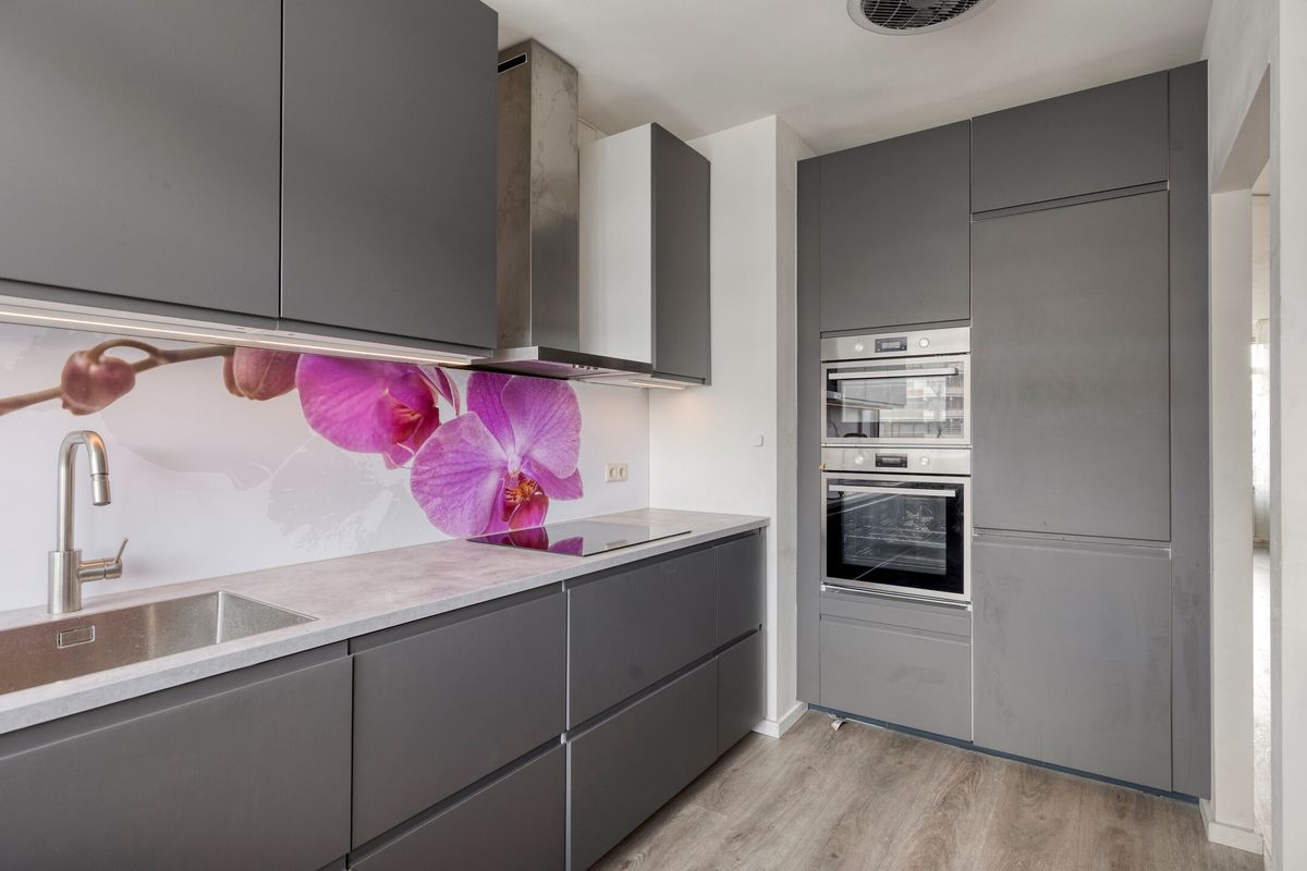 Aan de voorzijde de dichte keuken, voorzien van o.a. inductie-kookplaat, afzuigkap, oven, magnetron en vaatwasser.