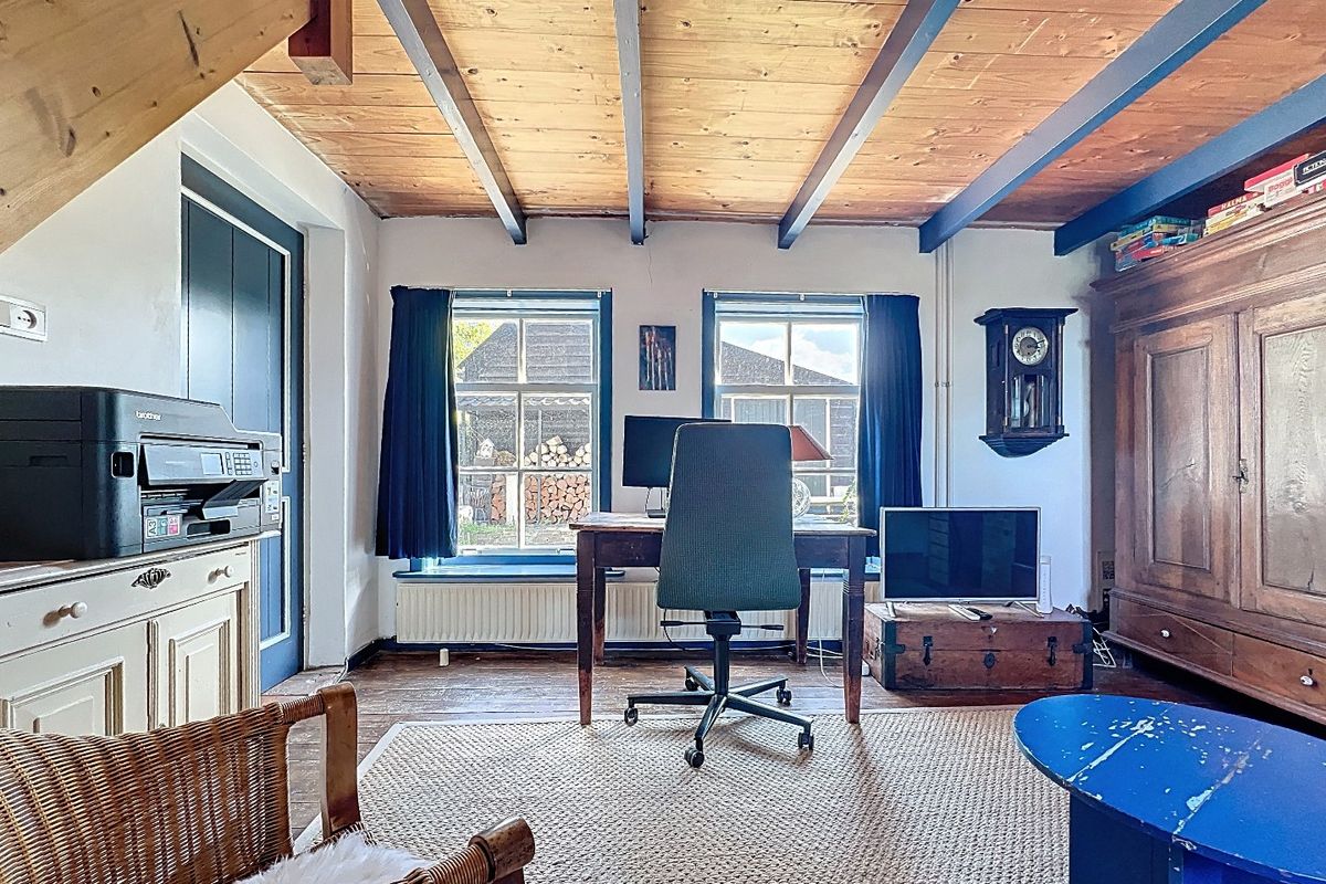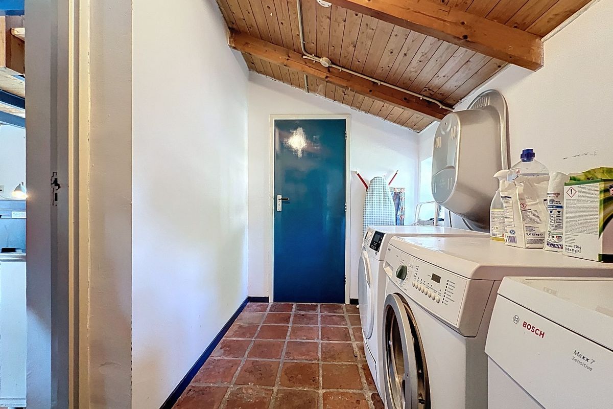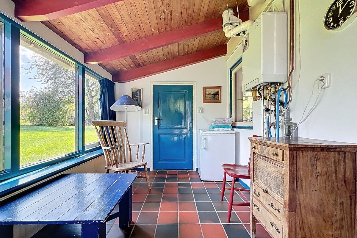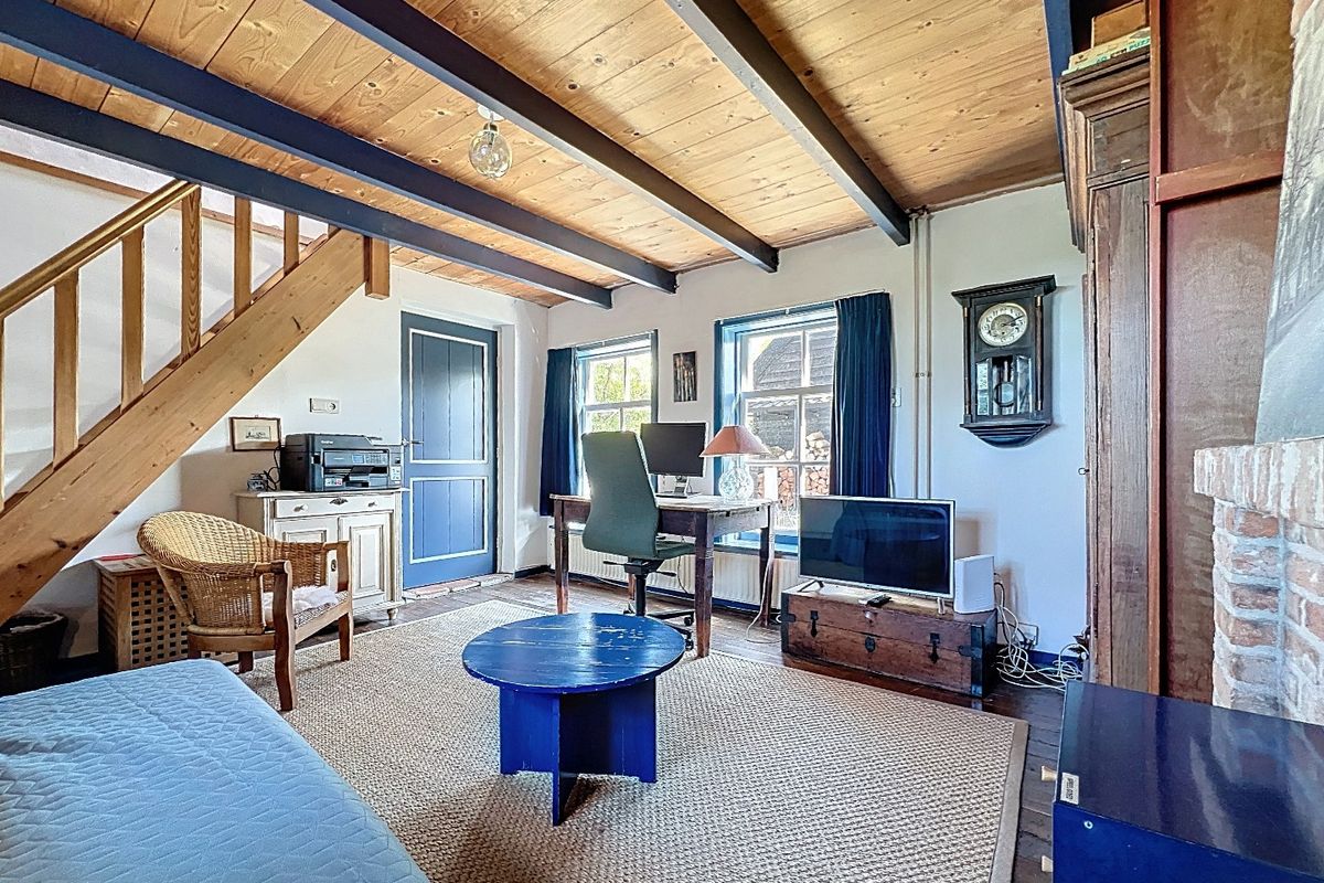 De ruime woonkamer, afgewerkt met plavuizen op de begane grond, wordt gekenmerkt door veel natuurlijk licht dat via ramen aan beide zijden naar binnen stroomt. De gezellige sfeer wordt versterkt door de houtkachel en het balkenplafond, waardoor het een warme en uitnodigende ruimte is. Aansluitend bevindt zich een sfeervol bureau, met een houten vloer, balkenplafond en volop daglicht, perfect voor werken of ontspannen. Vanuit deze ruimte is er toegang naar een gang met was- en drooginstallaties en een apart toilet.