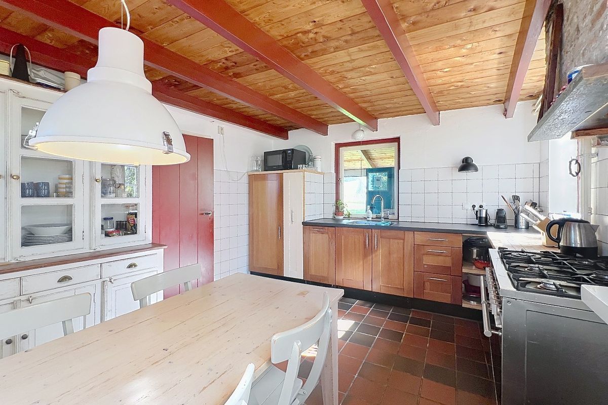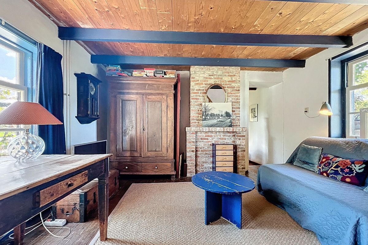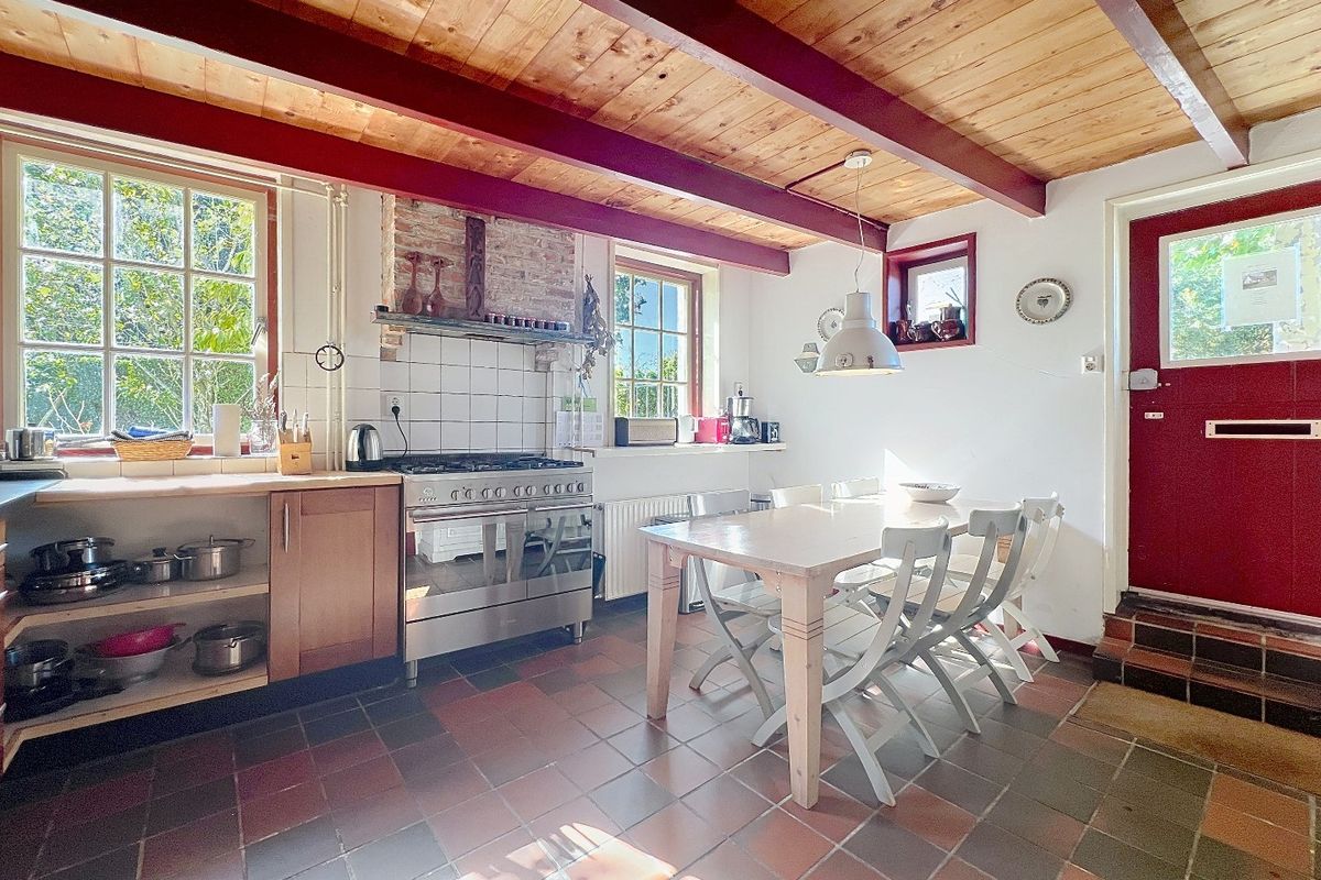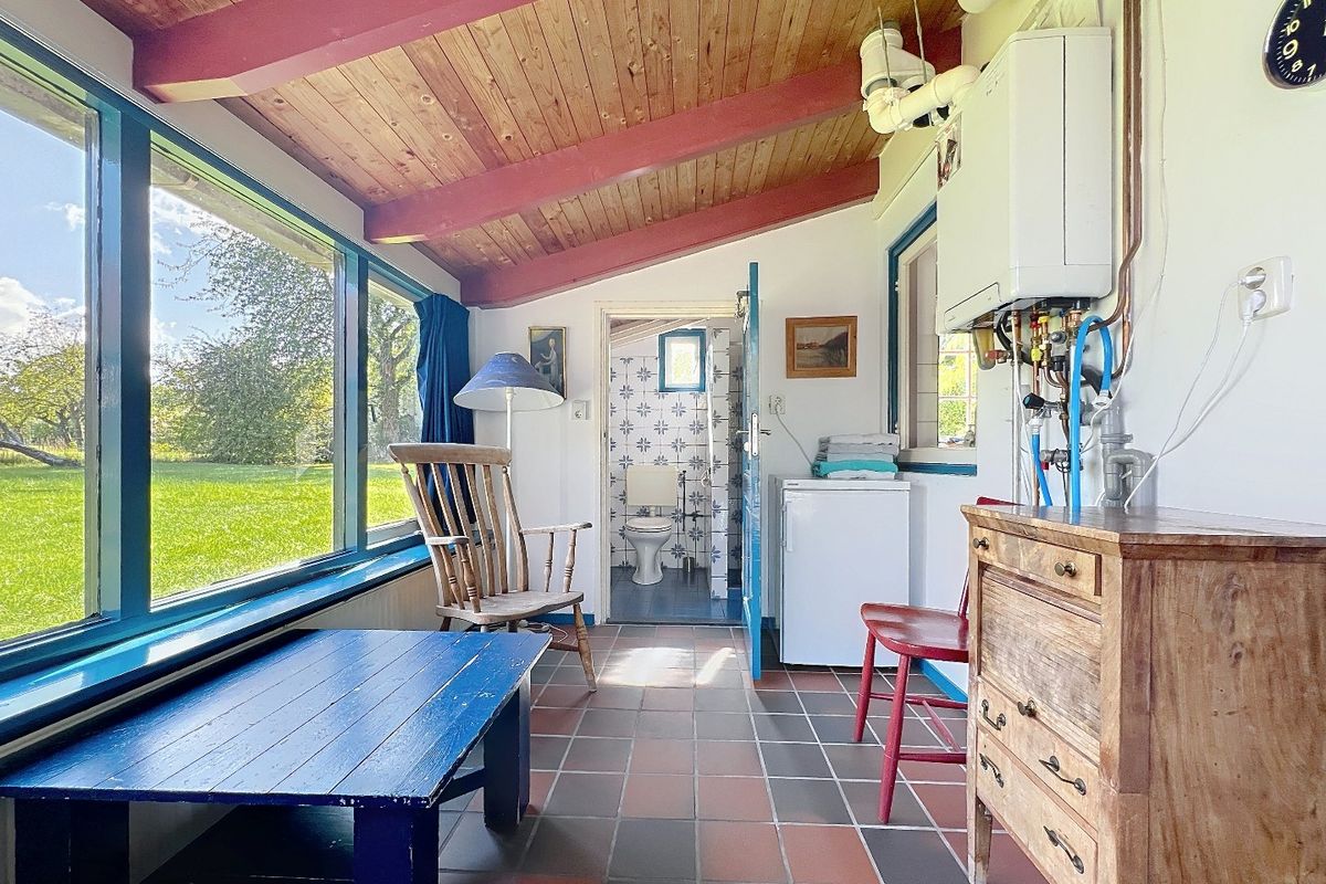 De ruime woonkamer, afgewerkt met plavuizen op de begane grond, wordt gekenmerkt door veel natuurlijk licht dat via ramen aan beide zijden naar binnen stroomt. De gezellige sfeer wordt versterkt door de houtkachel en het balkenplafond, waardoor het een warme en uitnodigende ruimte is. Aansluitend bevindt zich een sfeervol bureau, met een houten vloer, balkenplafond en volop daglicht, perfect voor werken of ontspannen. Vanuit deze ruimte is er toegang naar een gang met was- en drooginstallaties en een apart toilet.