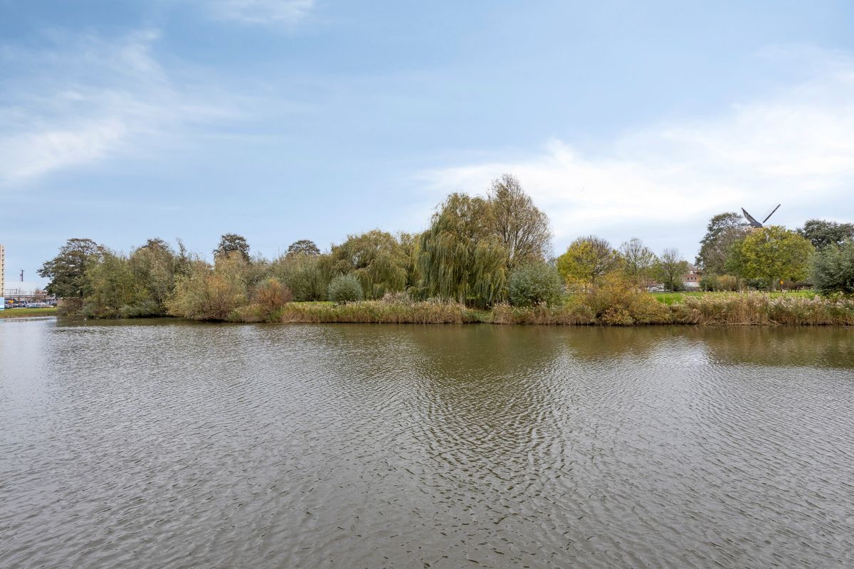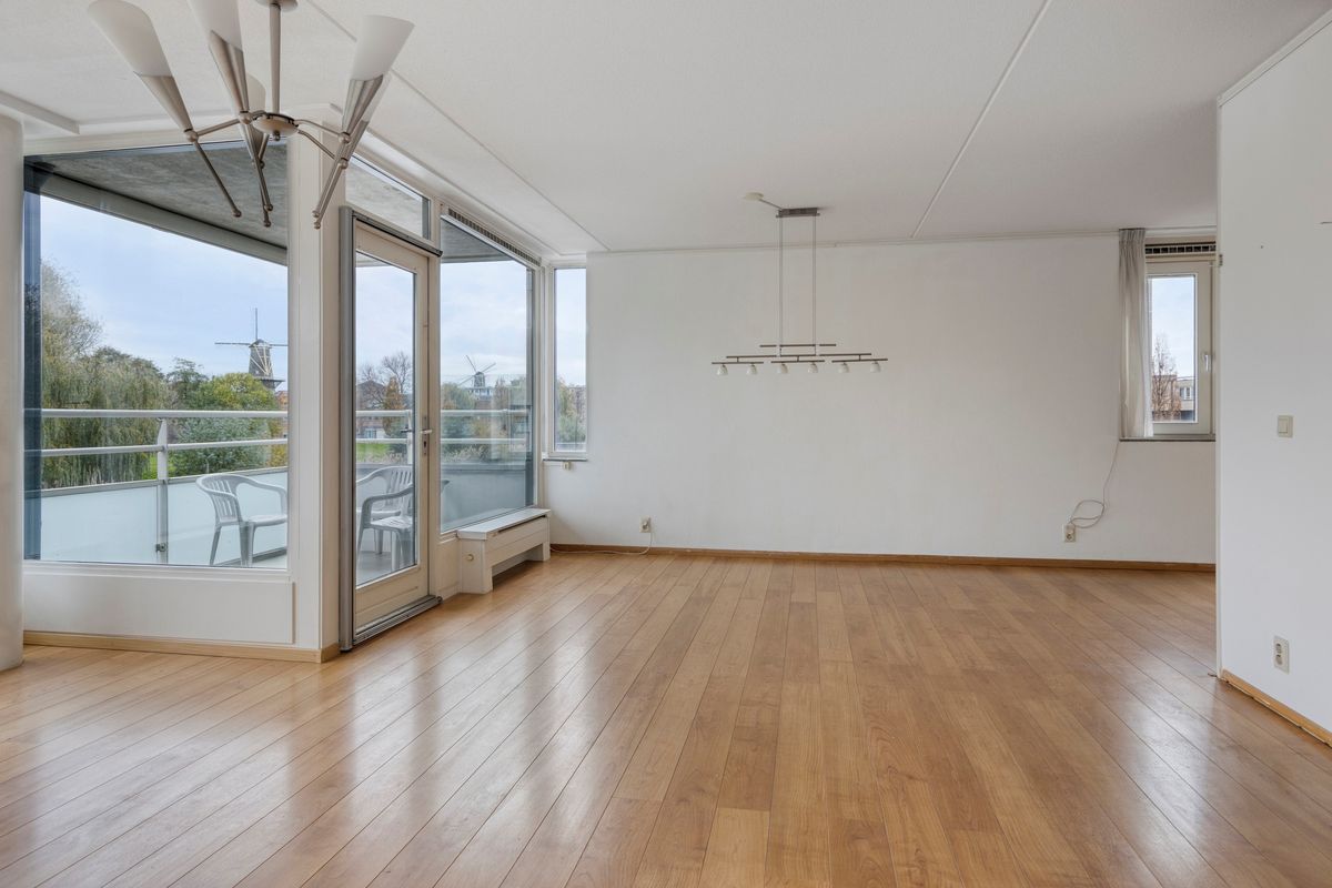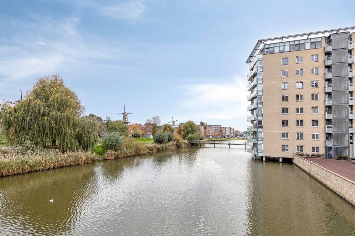 Vanuit de woonkamer en het balkon is er vrij uitzicht over het water en kijk je op de molens van Schiedam.