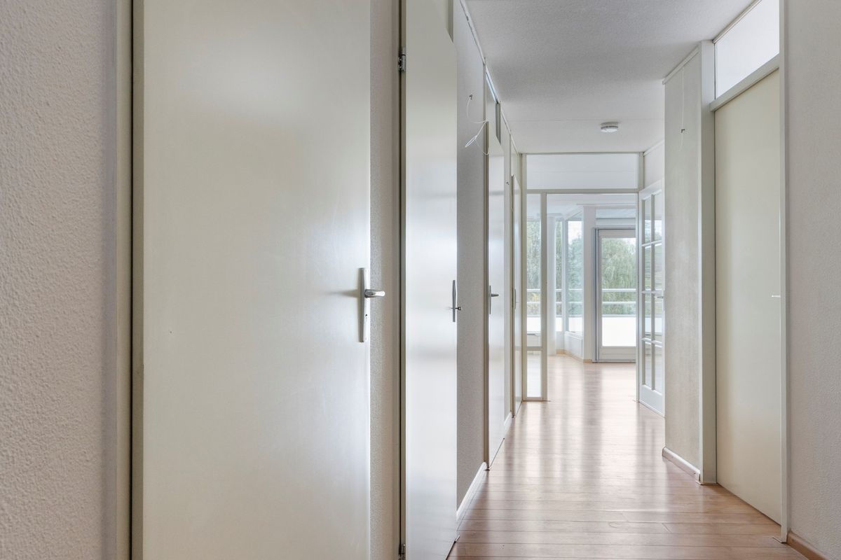 Entree van de woning, hal met toilet en meterkast, inpandige berging met wasmachine-aansluiting, ruime badkamer, 2 ruime slaapkamers, sfeervolle woonkamer met een nette open keuken. Vanuit de woonkamer is er toegang tot het fijne balkon met een heerlijk vrij uitzicht.