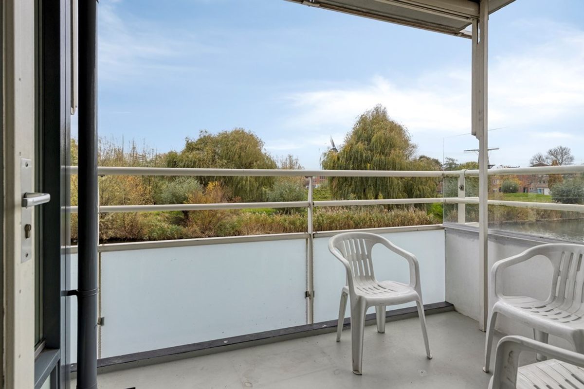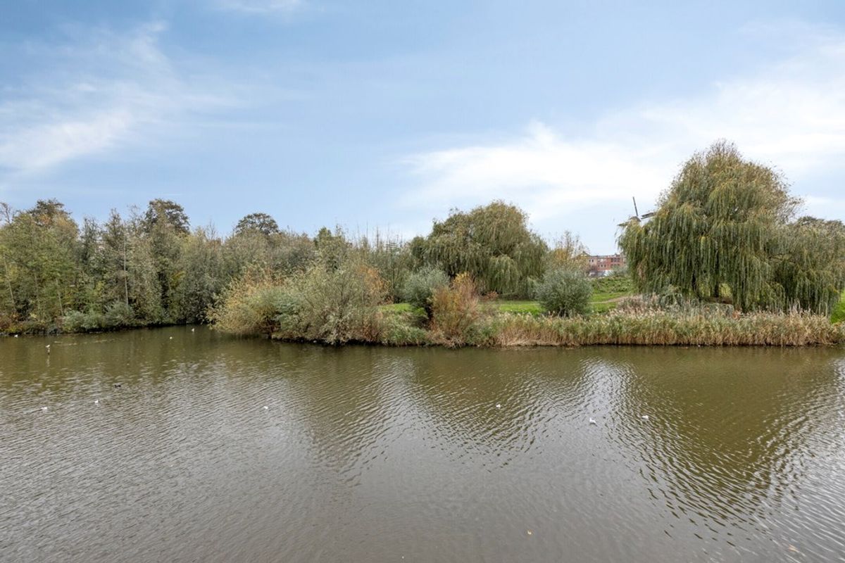 Vanuit de woonkamer en het balkon is er vrij uitzicht over het water en kijk je op de molens van Schiedam.