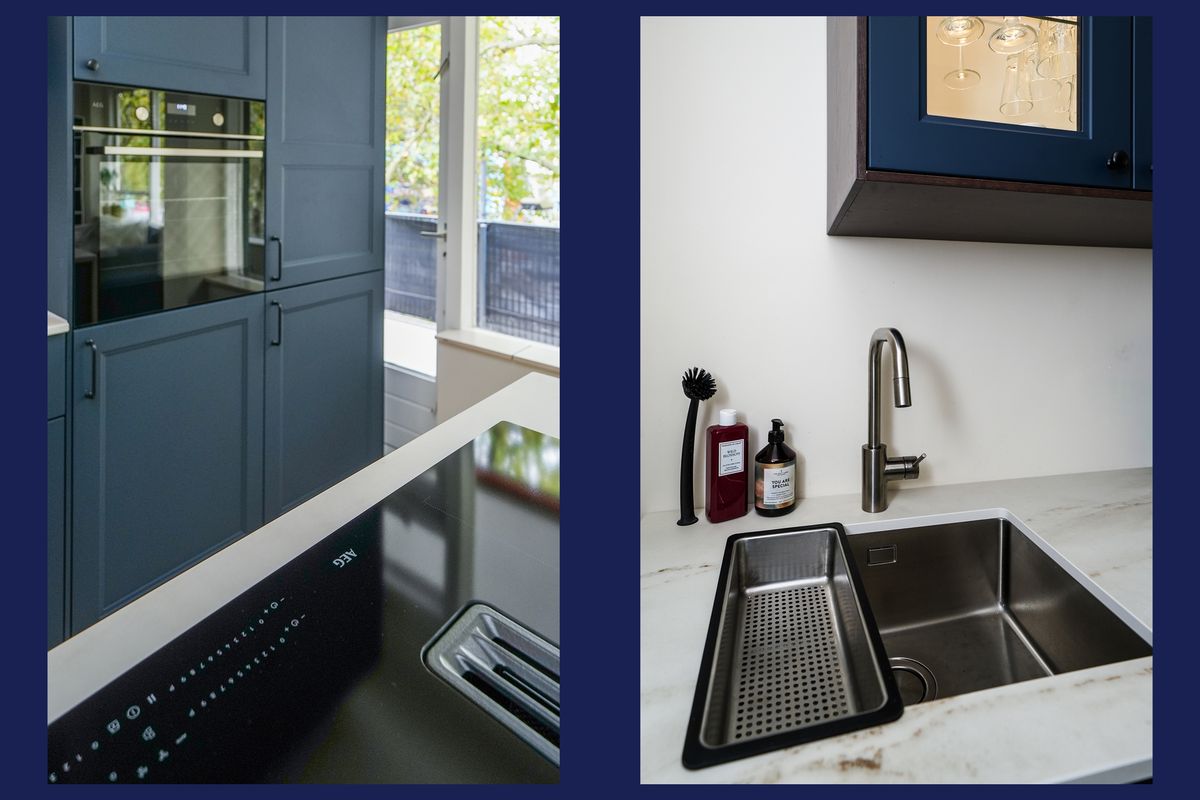 De open keuken is een echte eyecatcher: modern, luxe en volledig uitgerust met kwaliteitsapparatuur van Siemens, Bosch en AEG. Het natuurstenen kookeiland is prachtig uitgevoerd en voorzien van een inductiekookplaat met ingebouwde afzuiging.