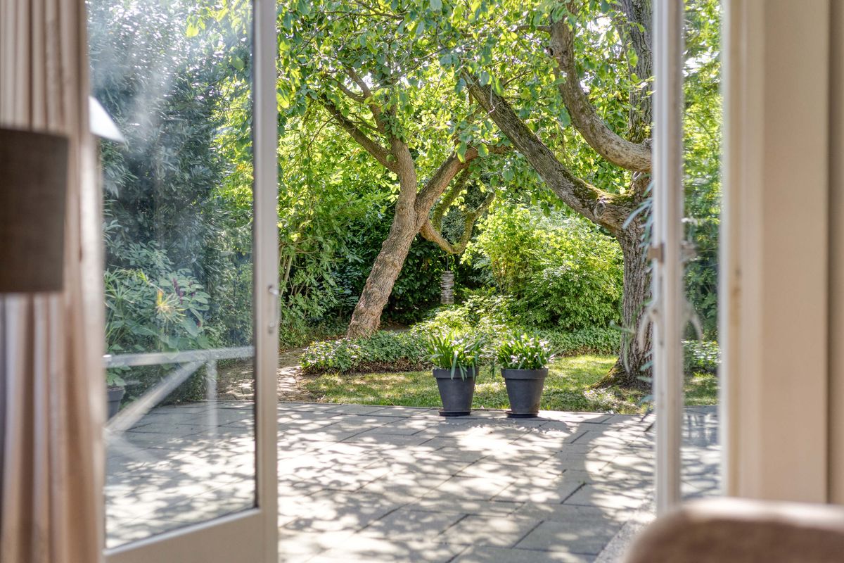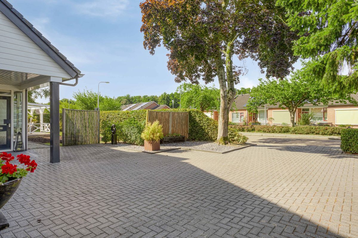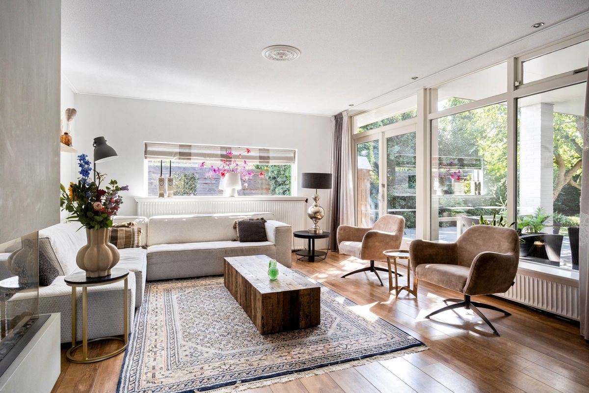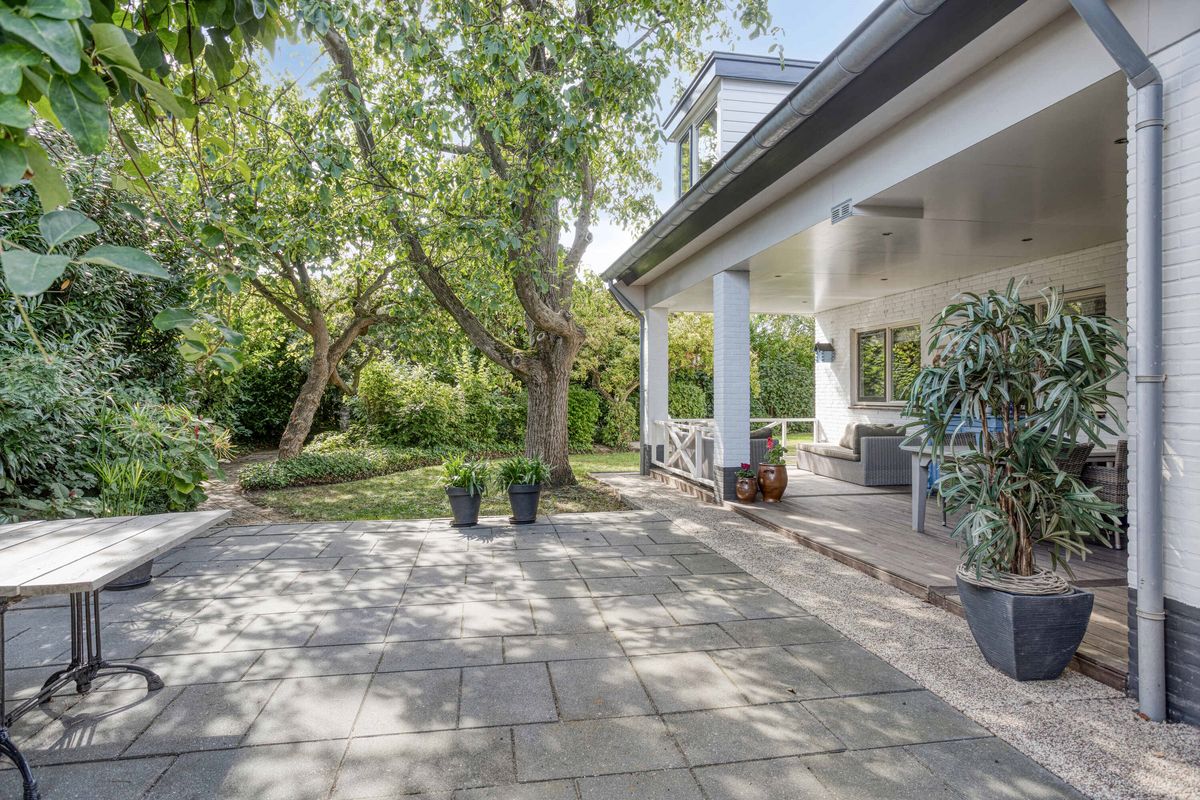 De tuin rondom de woning biedt volop privacy en groen, mede dankzij de gunstige hoekligging en lage bebouwing in de directe omgeving. Dankzij de verschillende terrassen – waaronder een overdekt terras direct grenzend aan de woonkamer – is er altijd een fijne plek om te zitten. De royale oprit biedt ruimte aan meerdere auto’s en de indeling van de woning zorgt ervoor dat je aan alle kanten verbonden bent met buiten.