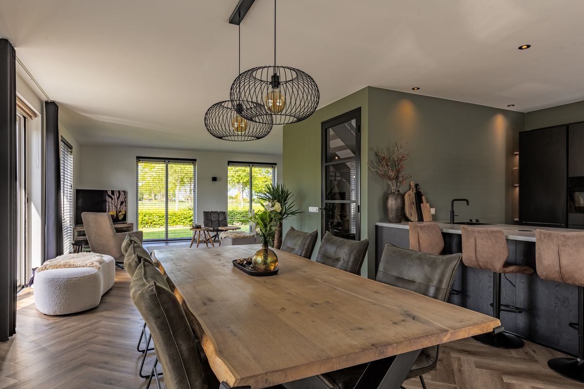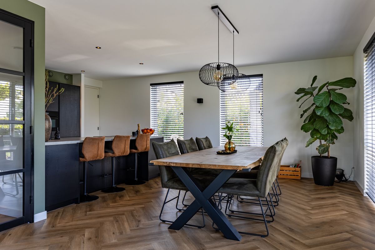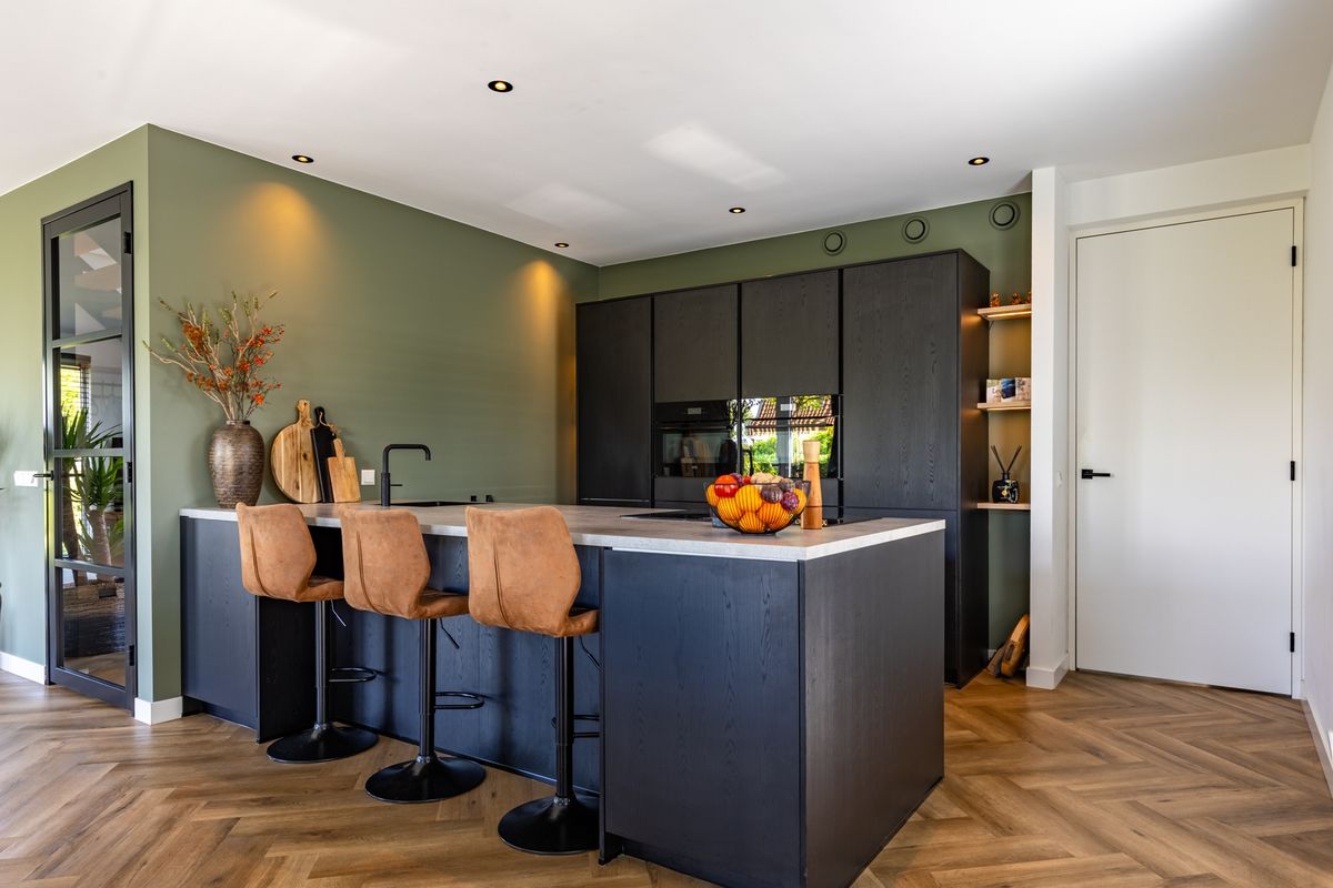 De woonkeuken is strak afgewerkt en van alle gemakken voorzien, zoals een inductiekookplaat met geïntegreerde afzuiging, dubbele combi-oven/magnetron, koelkast, vaatwasser en Quooker. Aansluitend is de bijkeuken met een kastenwand voor extra bergruimte en voorzien van wasmachine- en drogeraansluiting. Daarnaast is er nog een extra kamer met eigen ingang vanaf de oprit. Ideaal als thuiskantoor of slaapkamer op de begane grond.