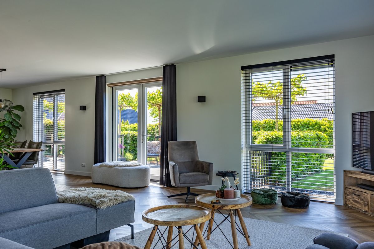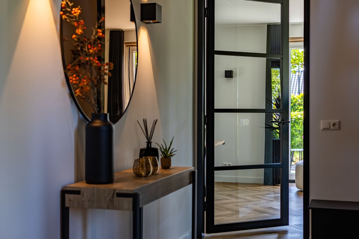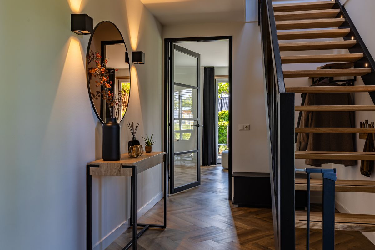 Je komt binnen in een ruime hal met moderne toiletruimte en een trapopgang met stijlvolle trapverlichting. Vanuit hier loop je door naar de open en lichte woonkamer. Dankzij de royale raampartijen tot de vloer en de openslaande deuren naar de tuin geniet je hier van veel daglicht en vrij uitzicht. De ramen zijn bovendien voorzien van elektrische screens.