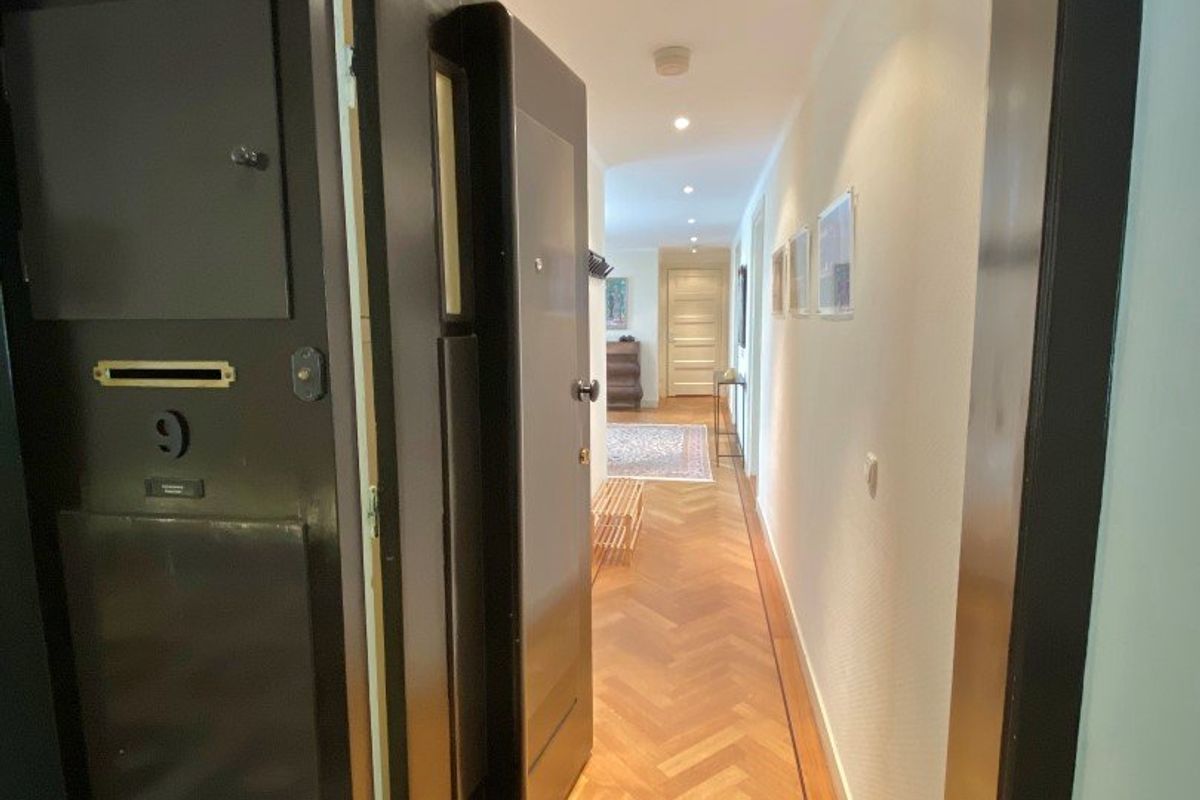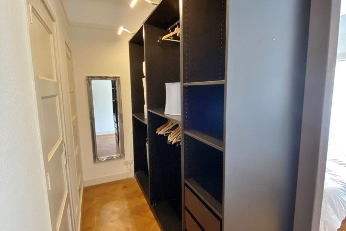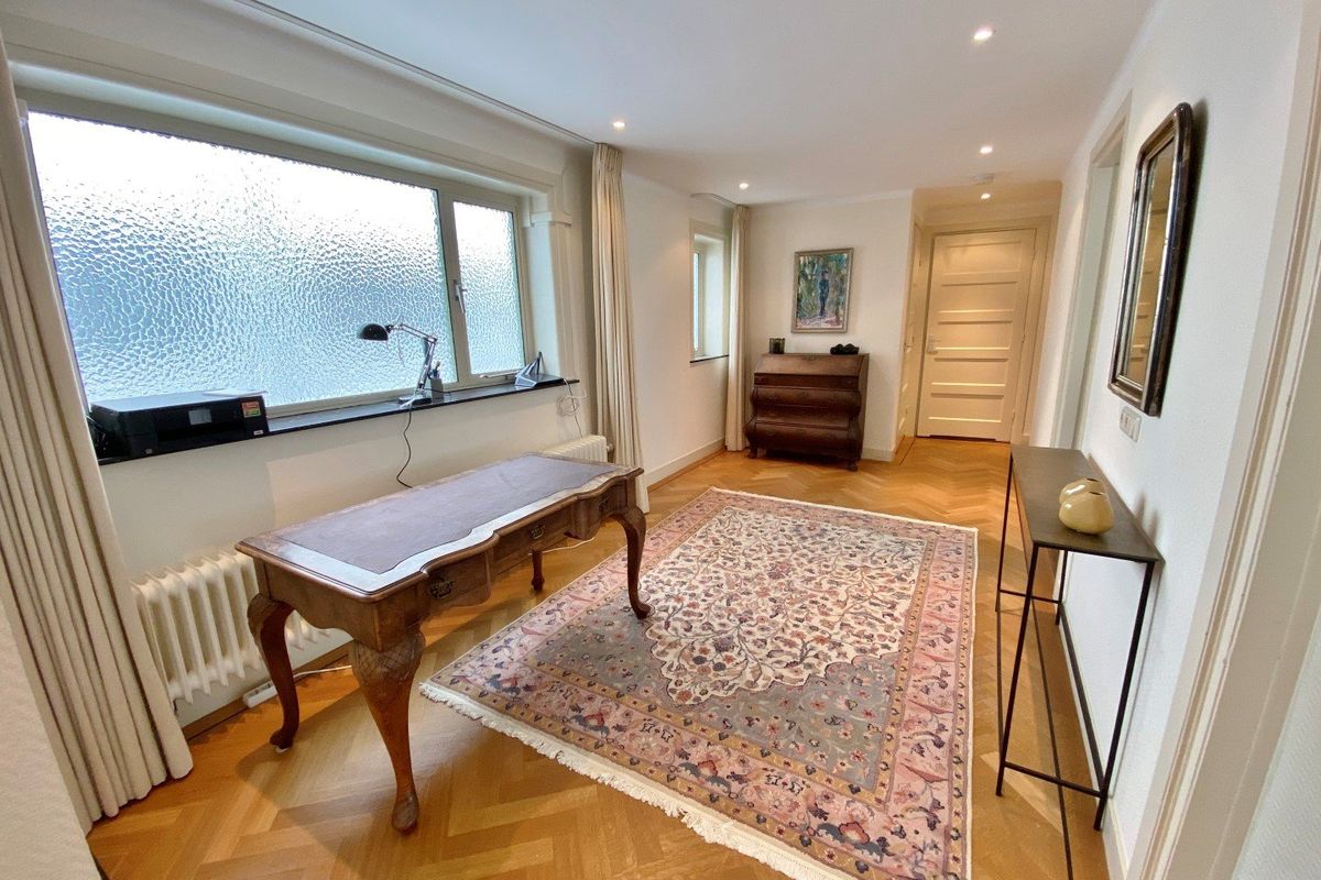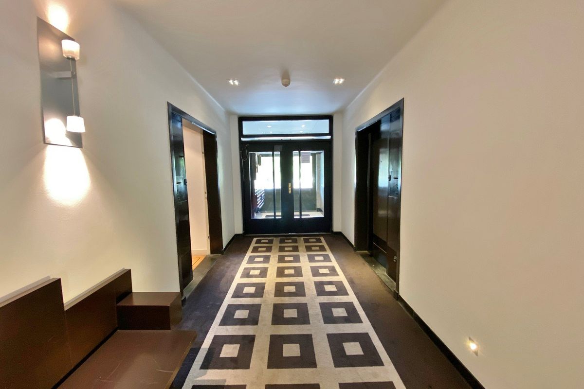 Stylish main entrance. Enclosed connecting door with access to the representative large (just luxuriously renovated) lobby with porter's lodge. Entrance apartment. Spacious hall of 10.00 x 1.10 partly 2.70 wide, modern separate toilet. Spacious and bright living/dining room en suite with the original sliding partition and a marble fireplace, front room 5.37 x 4.63, back room that can easily be converted into a guest room/bedroom 5.36 x 3.71. Luxury kitchen 3.14 x 2.50 with stone worktop and equipped with various appliances including electric hob, microwave, fridge / freezer, extractor and dishwasher. Cupboard with washer / dryer. Spacious bedroom 4.93 x 3.75 with two closets and access to balcony. Modern bathroom 2.72 x 1.75 with bath, separate shower and sink.