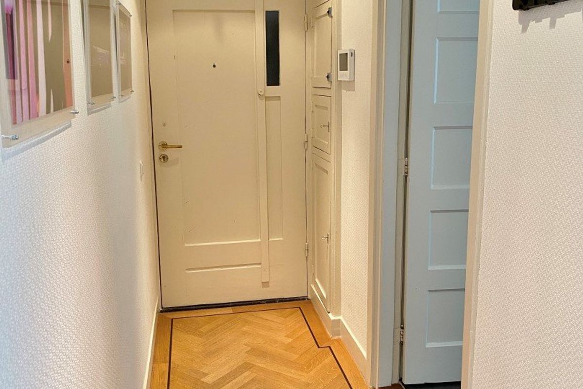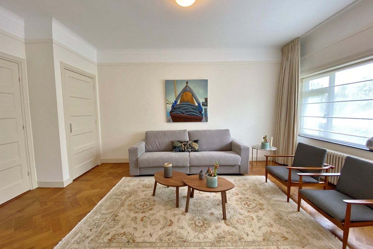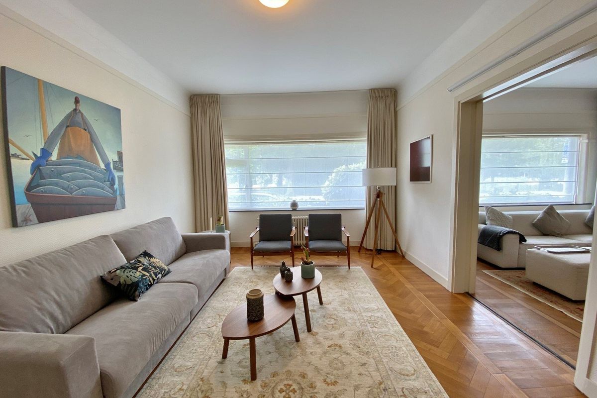 Stijlvol hoofdentree. Afgesloten tussendeur met toegang tot de representatieve grote (zojuist zeer luxe gerenoveerde) ontvangsthal met portiersloge. Entree appartement. Royale hal van (10.00 x 1.10 deels 2.70 breed), modern toilet. Ruime en lichte woon-/eetkamer en suite met de originele schuifseparatie en een marmeren schouw, voorkamer (5.37 x 4.63), achterkamer waar makkelijk een logeerkamer/slaapkamer van gemaakt kan worden (5.36 x 3.71) met slaapbank. Luxe keuken (3.14 x 2.50) met hardstenen werkblad en voorzien van diverse inbouwapparatuur o.a. elektrische kookplaat, combimagnetron, koel-/vriescombinatie, afzuigkap en vaatwasser. Vaste kast met opstelling wasmachine/droger. Ruime slaapkamer (4.93 x 3.75) met twee vaste kasten en toegang tot balkon. Moderne badkamer (2.72 x 1.75) met ligbad, separate douche en vaste wastafel.