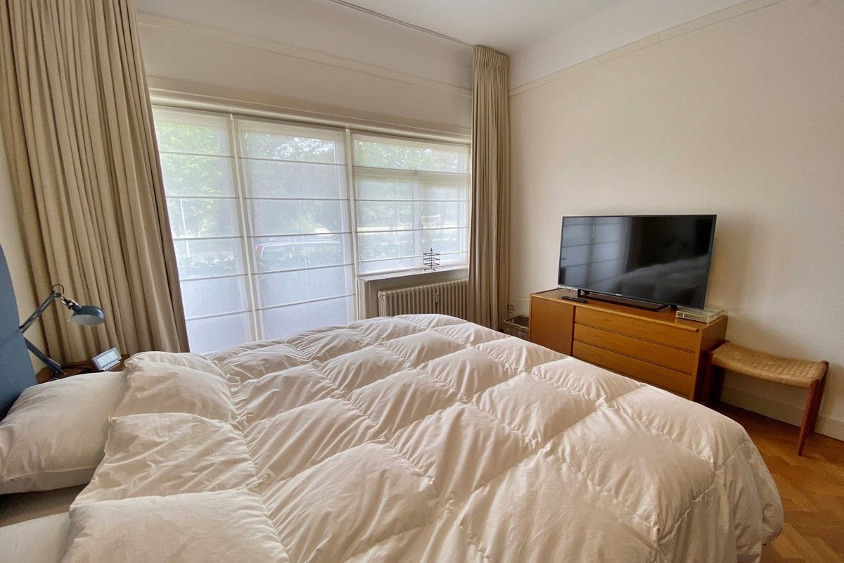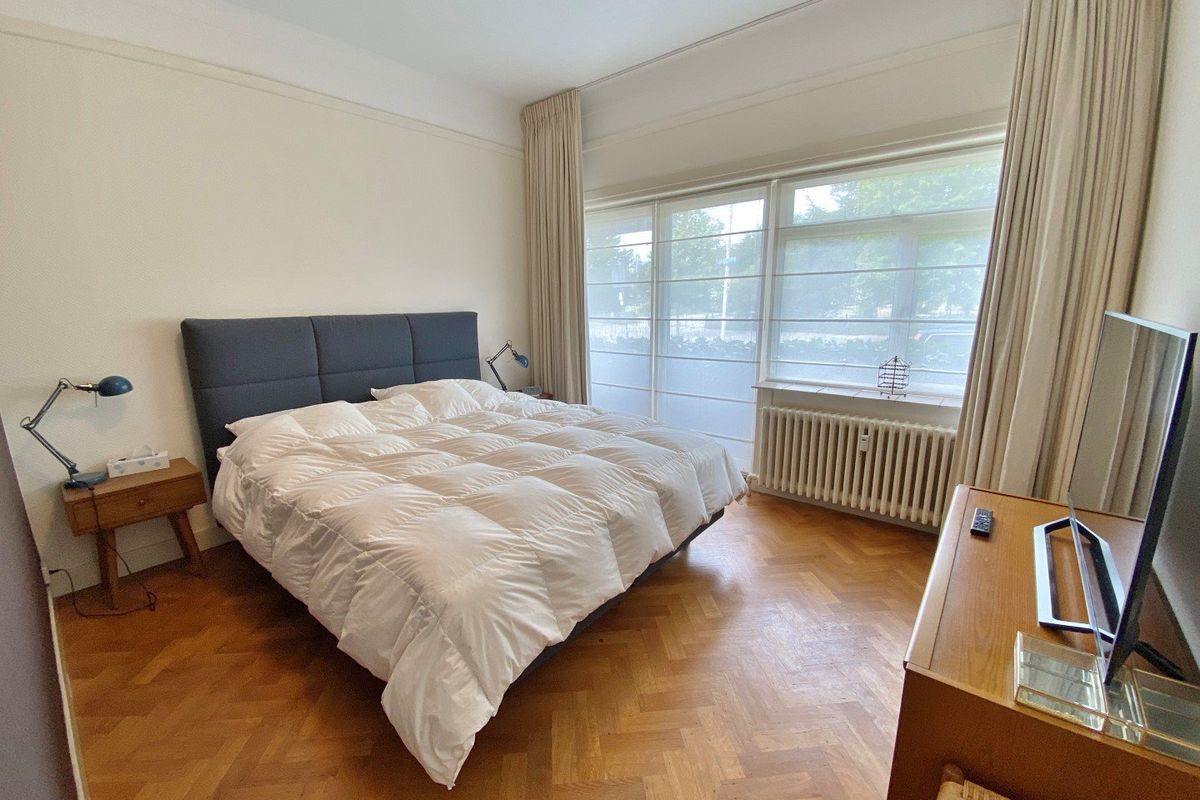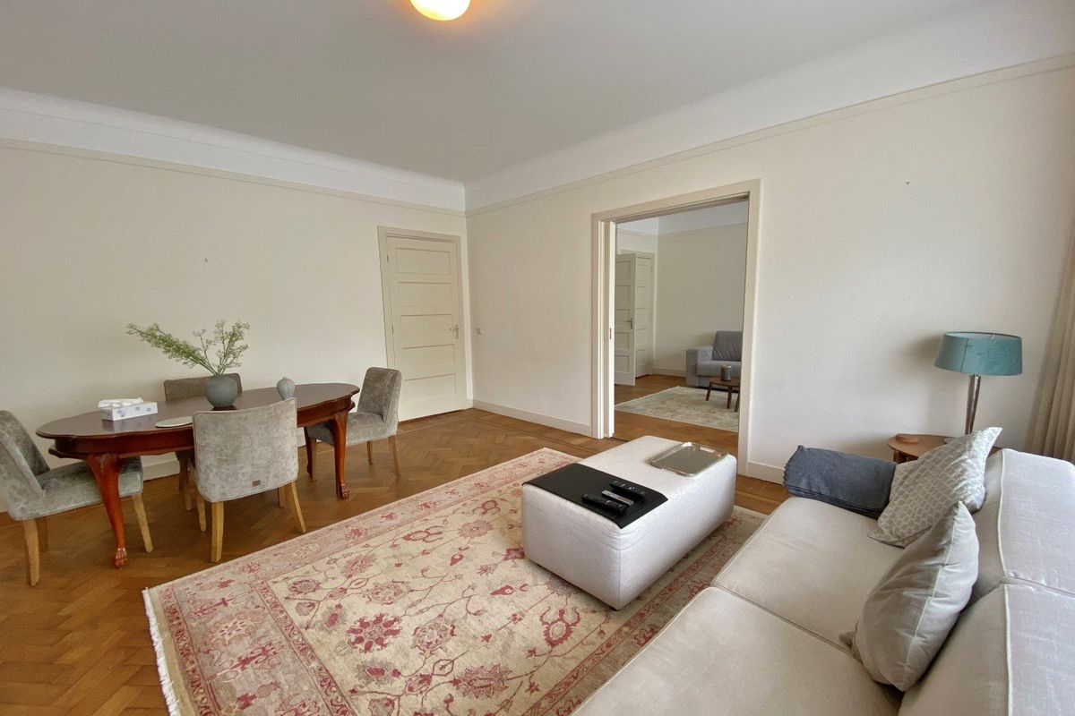 Situated on a small park, you will find this furnished 4 room (1/2 bedrooms) ground floor apartment of 102m² with a balcony at the front, a bicycle storage room and private parking.