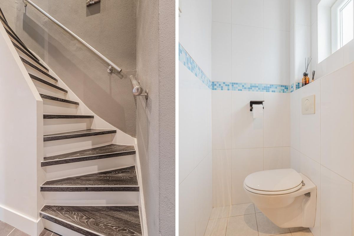 De hal met tegelvloer is voorzien van een meterkast, toilet en trap naar de 1e verdieping.