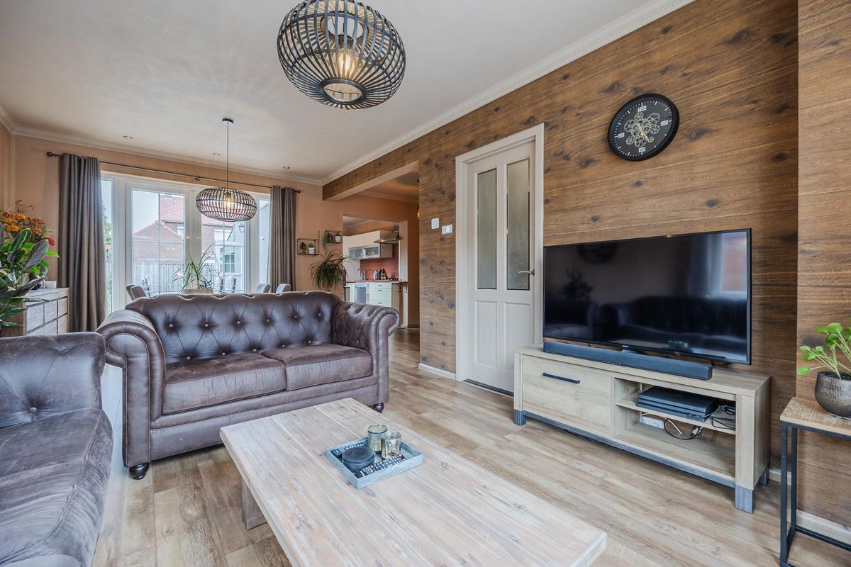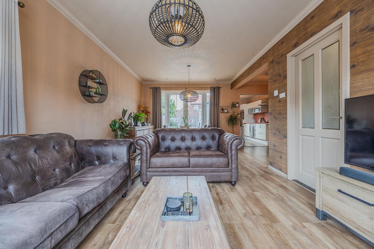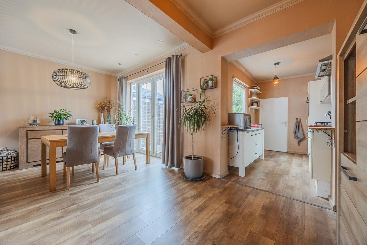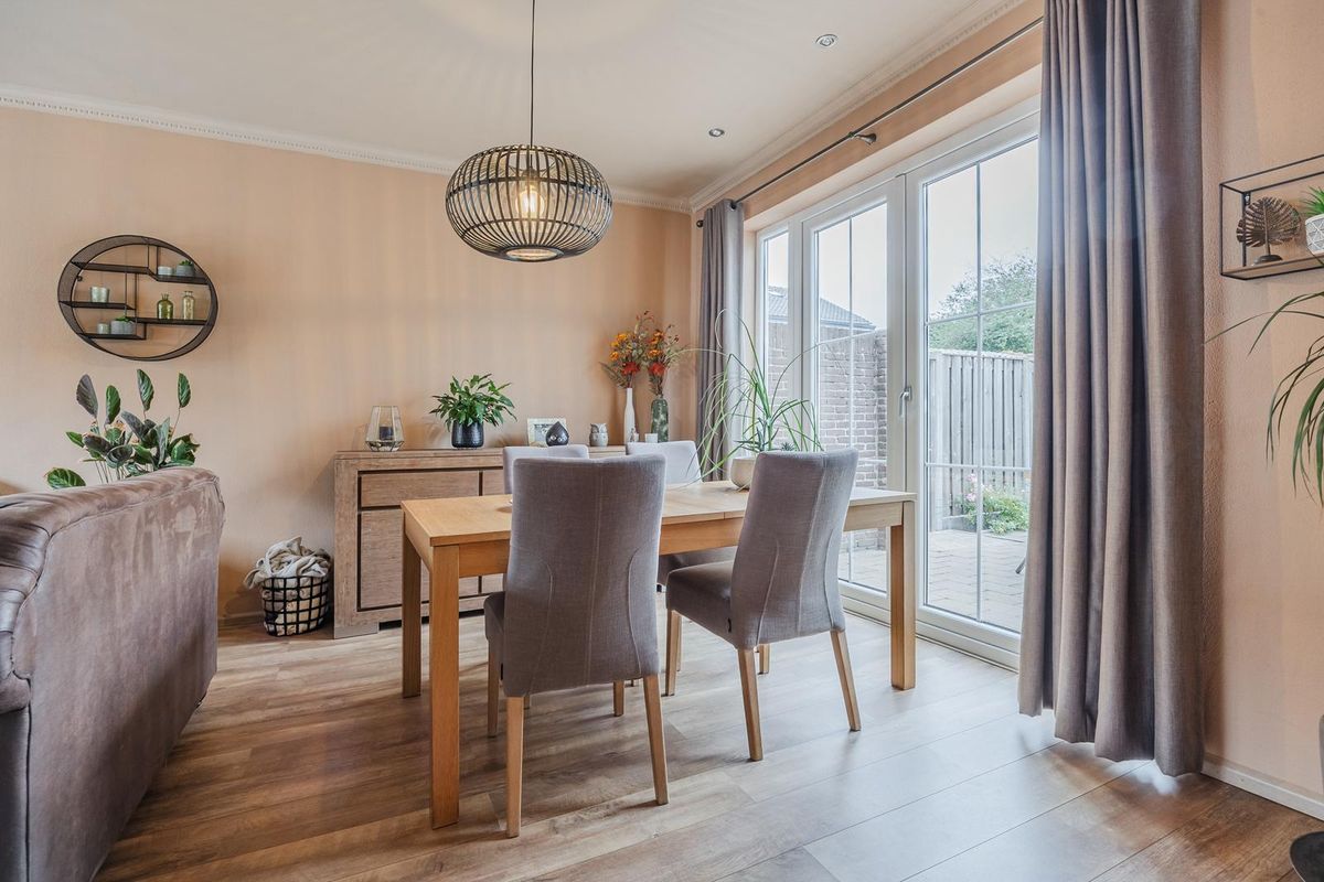 De woonkamer met laminaatvloer beschikt over sfeervolle openslaande deuren die toegang bieden tot de achtertuin. Via de woonkamer komt u in de keuken.