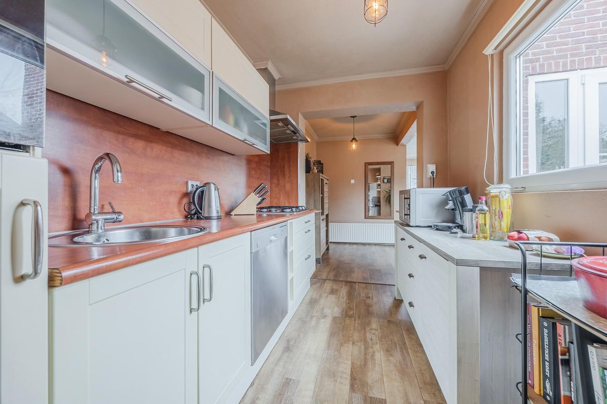 De keuken met laminaatvloer is in de uitbouw naar achteren geplaatst. De keuken is voorzien van inbouwapparatuur: 4-pits gaskookplaat, afzuigkap, oven, koelkast en een vaatwasser. Vanuit de keuken heeft u zicht op de achtertuin en heeft u toegang tot de bijkeuken.