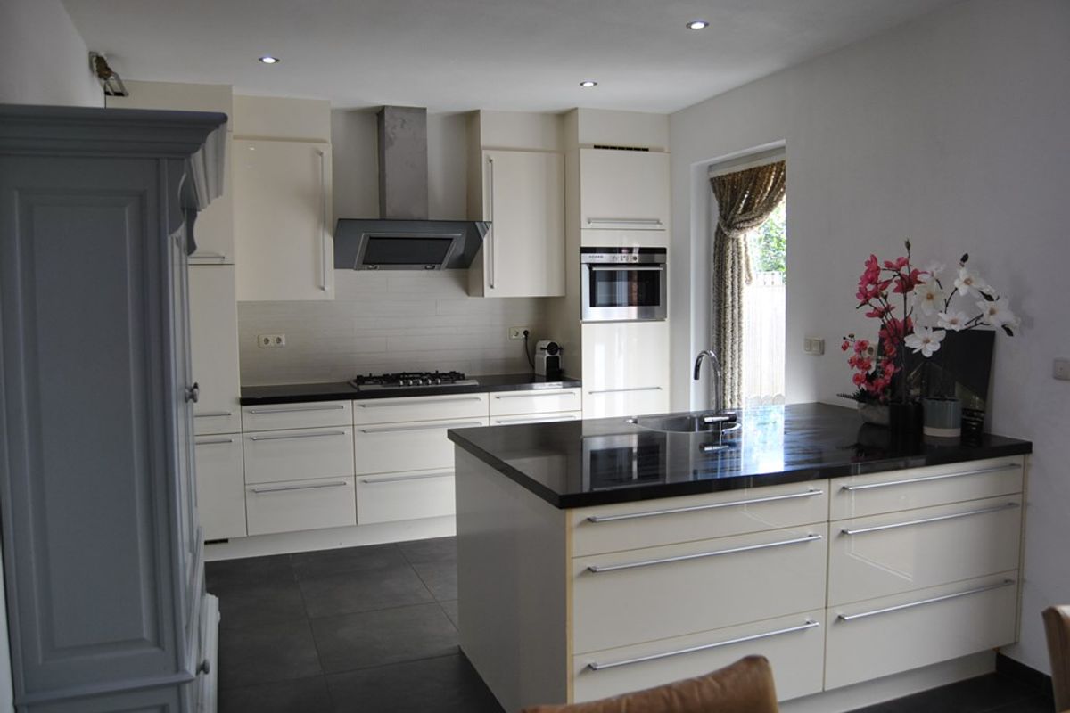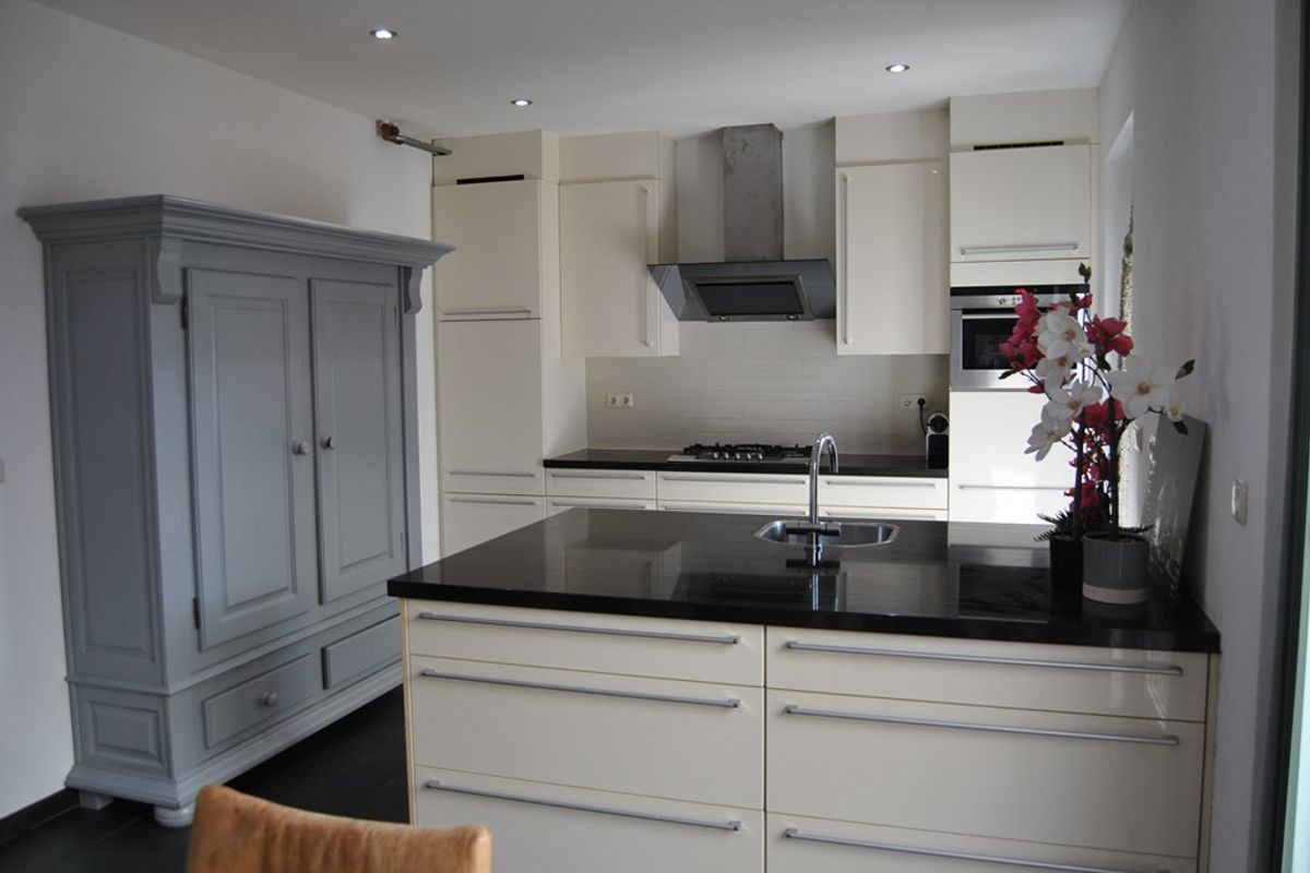 Je komt binnen in de hal met trapopgang en toiletruimte. Vanuit hier loop je door naar de ruime woonkamer met veel daglicht en een aanbouw met open keuken. De keuken is van alle gemakken voorzien: gaskookplaat, afzuigkap, oven, koelkast, vaatwasser en volop kastruimte.