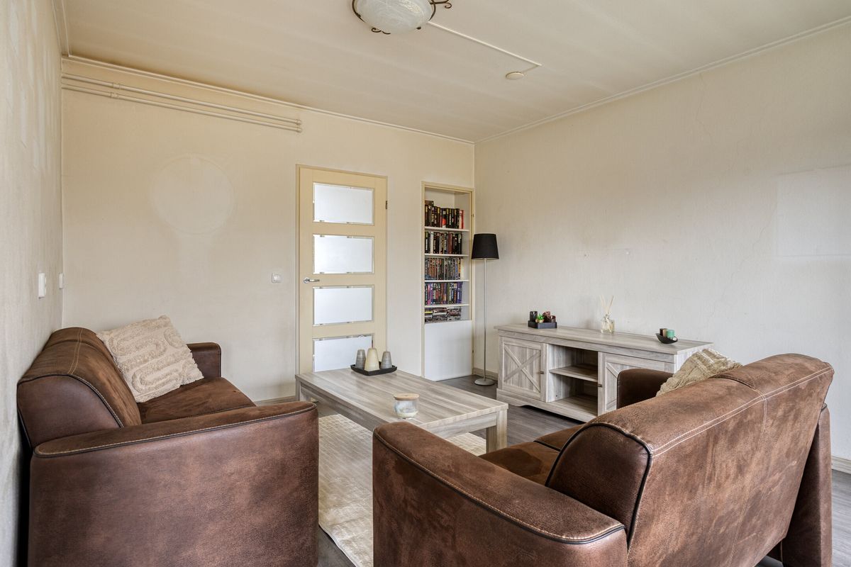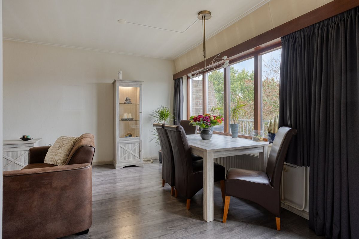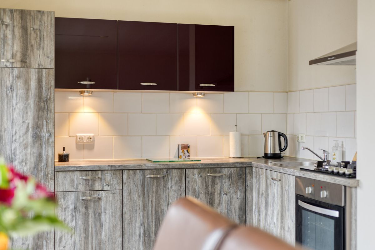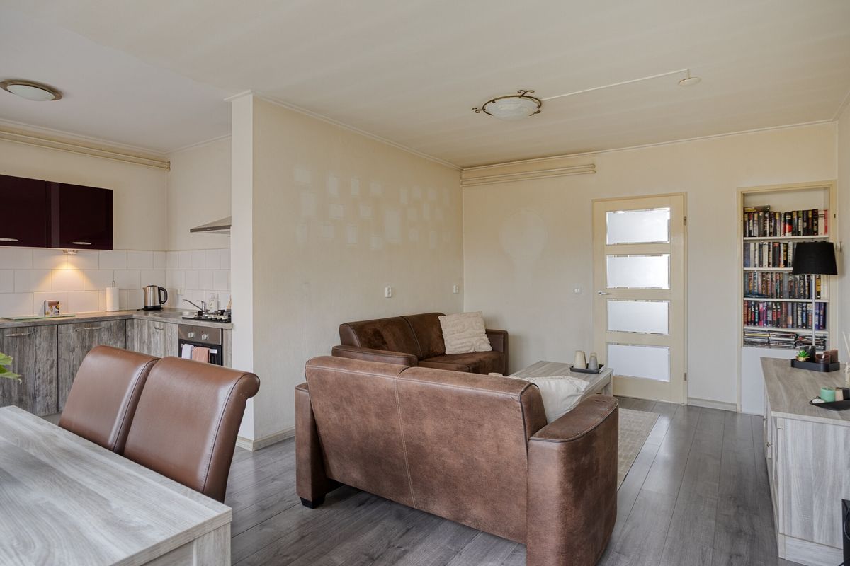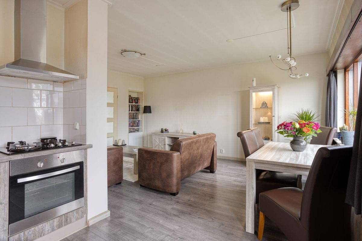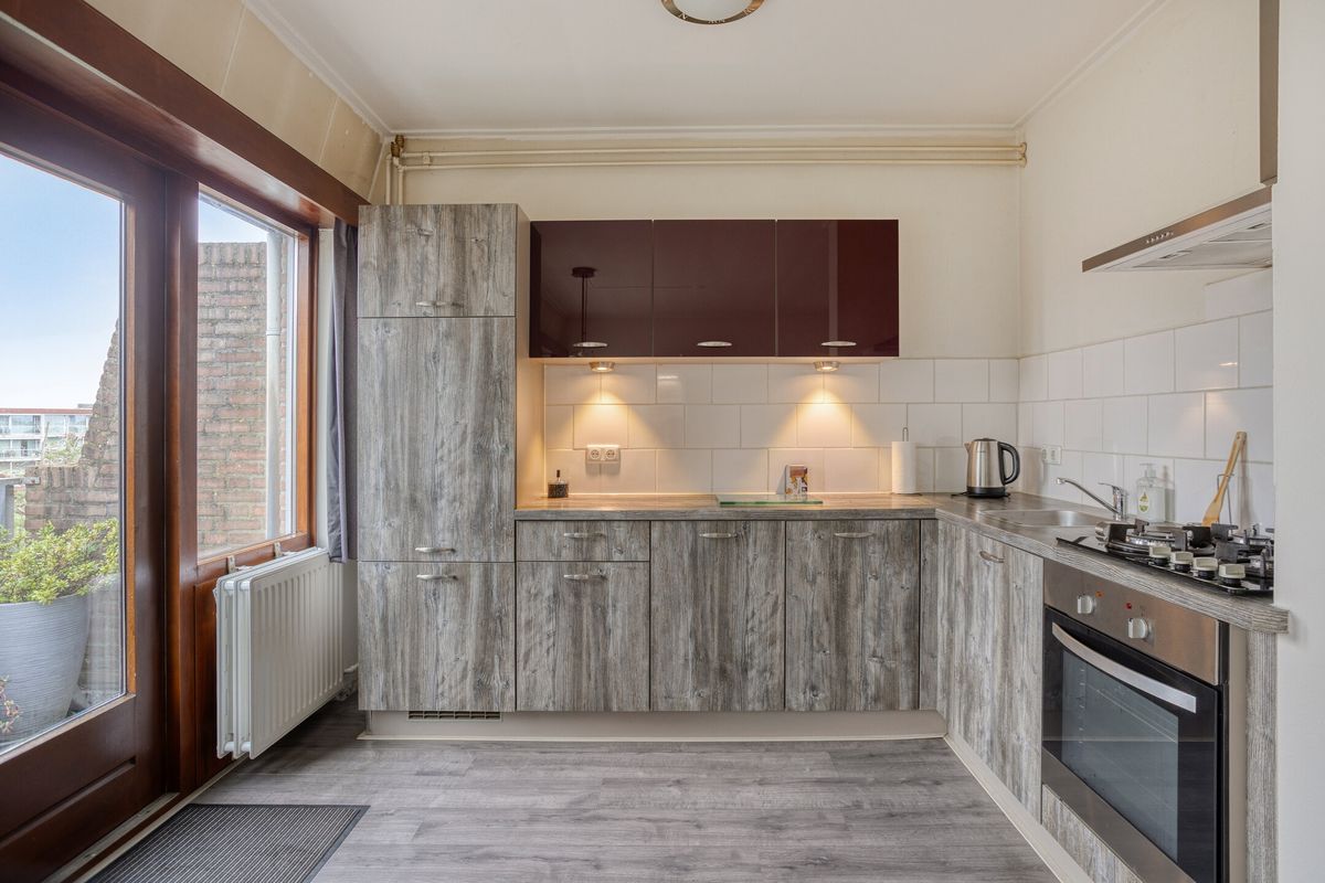 De lichte L-vormige woonkamer heeft biedt een prachtig uitzicht op het Julianapark. De open keuken (ca. 7-8 jaar oud), is voorzien van een 4-pits gaskookplaat, koelkast, afzuigkap en oven.