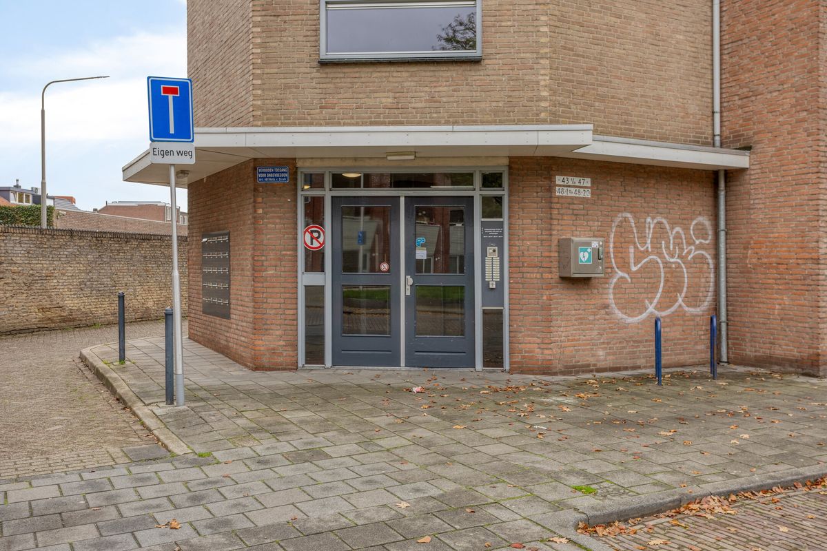 Aan de straatzijde bevindt zich de centrale entree met brievenbussen, lift en trapopgang. Achter het complex ligt een afgesloten terrein met bergingen en een gezamenlijke parkeerplaats. Parkeren op eigen terrein is dus mogelijk, maar er zijn wel een beperkt aantal plaatsen beschikbaar.