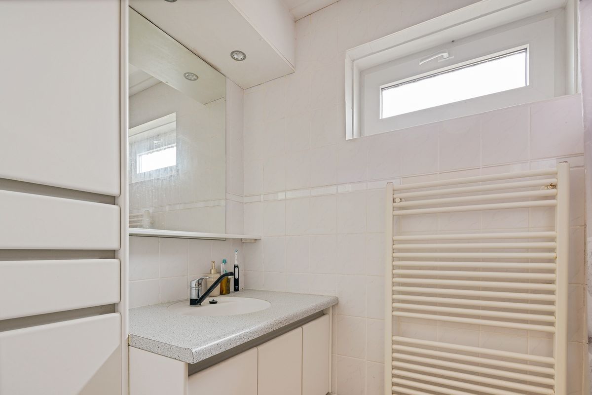 Overloop, drie slaapkamers badkamer met douche en wastafel.