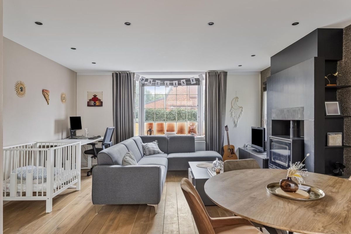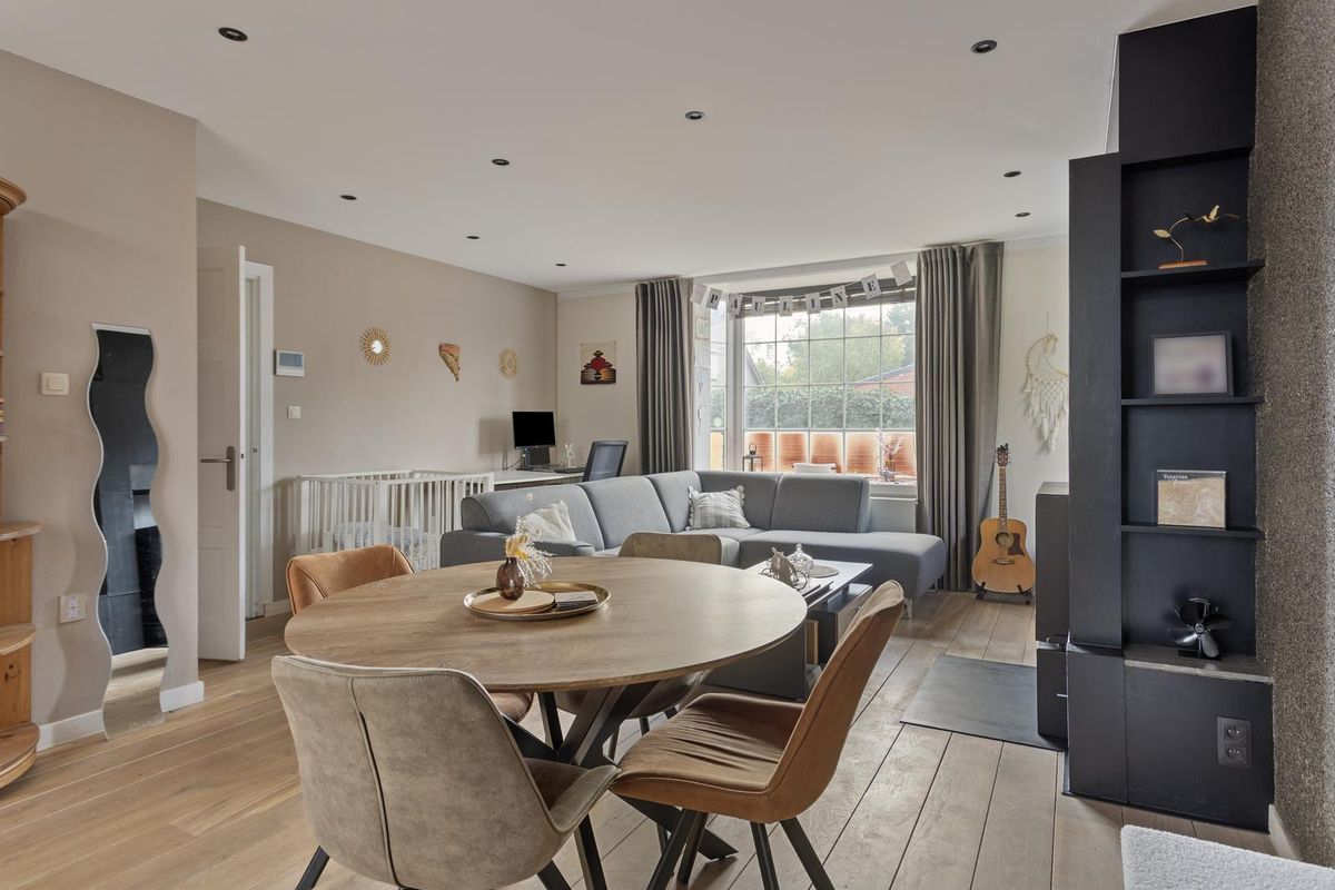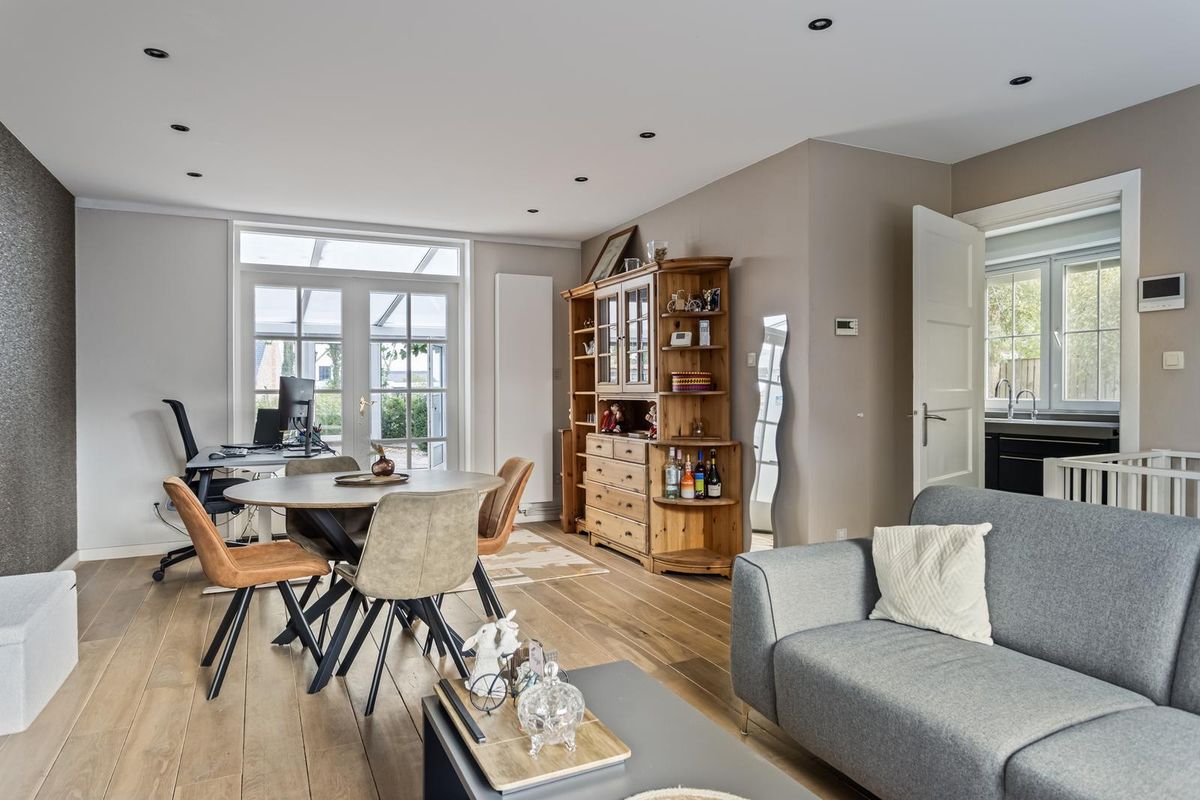 De gezellige woonkamer met houten vloer en houthaard nodigt uit tot ontspannen avonden. Aansluitend vind je de serre, eveneens voorzien van houten vloer en verwarming, waar je het hele jaar door geniet van uitzicht op de prachtige tuin.