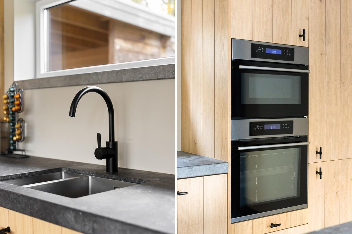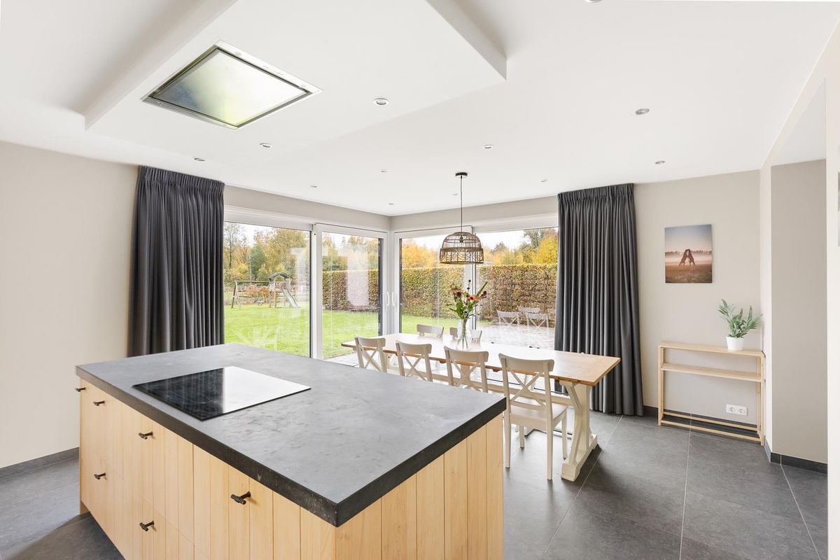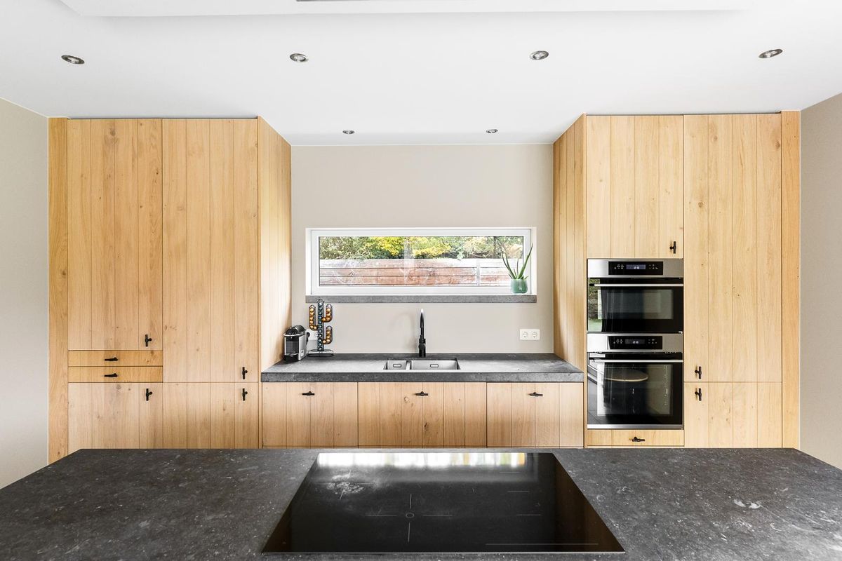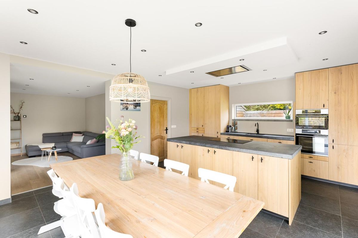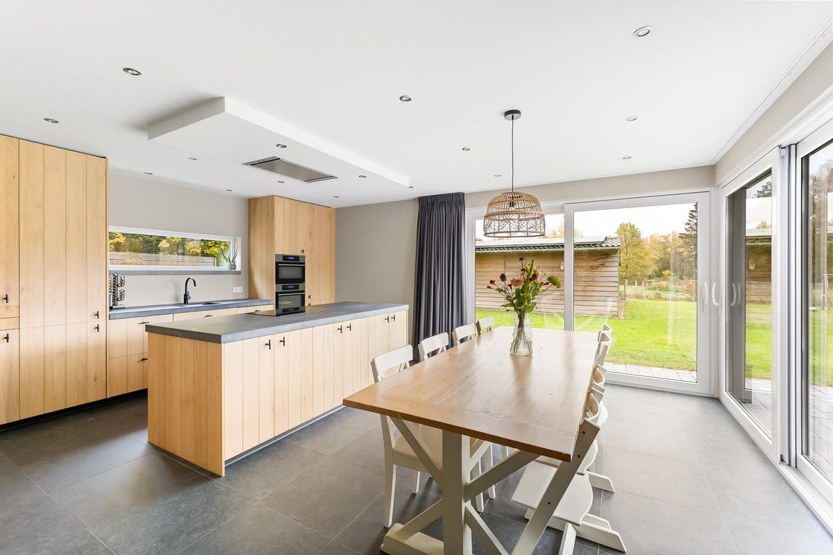 De luxe woonkeuken is een echte blikvanger: strak, warm en praktisch tegelijk, voorzien van moderne inbouwapparatuur, veel kastruimte en schuifdeuren naar het terras. Direct grenzend aan de keuken bevindt zich een gezellige overkapping – ideaal om ook op minder zonnige dagen buiten te eten of te ontspannen.
