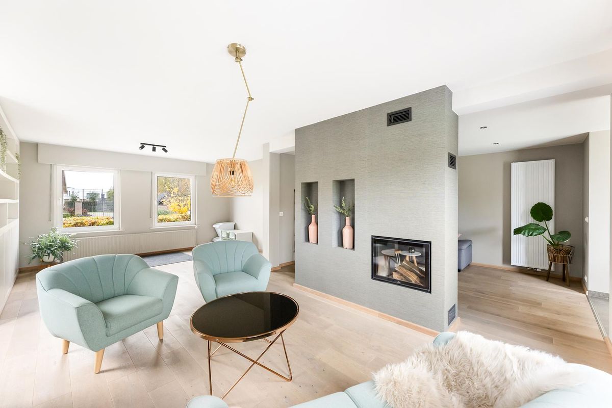 Via de hal met trapopgang bereik je de ruime woonkamer, die bestaat uit twee gezellige zitgedeeltes en een eigentijdse haardpartij. De grote ramen zorgen voor veel lichtinval en een prachtig uitzicht op de tuin en de achterliggende weides.
