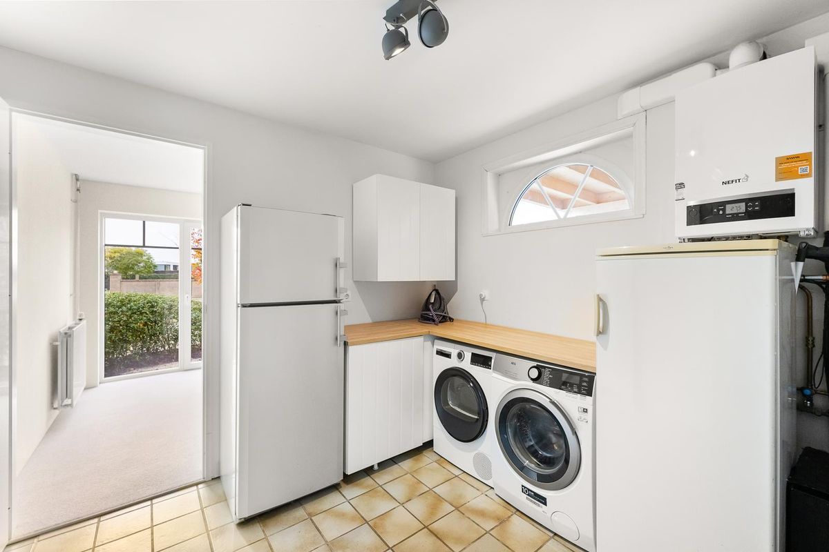 Verder vind je op de begane grond een kantoor, een bijkeuken met wasvoorzieningen en extra bergruimte, en een toilet.