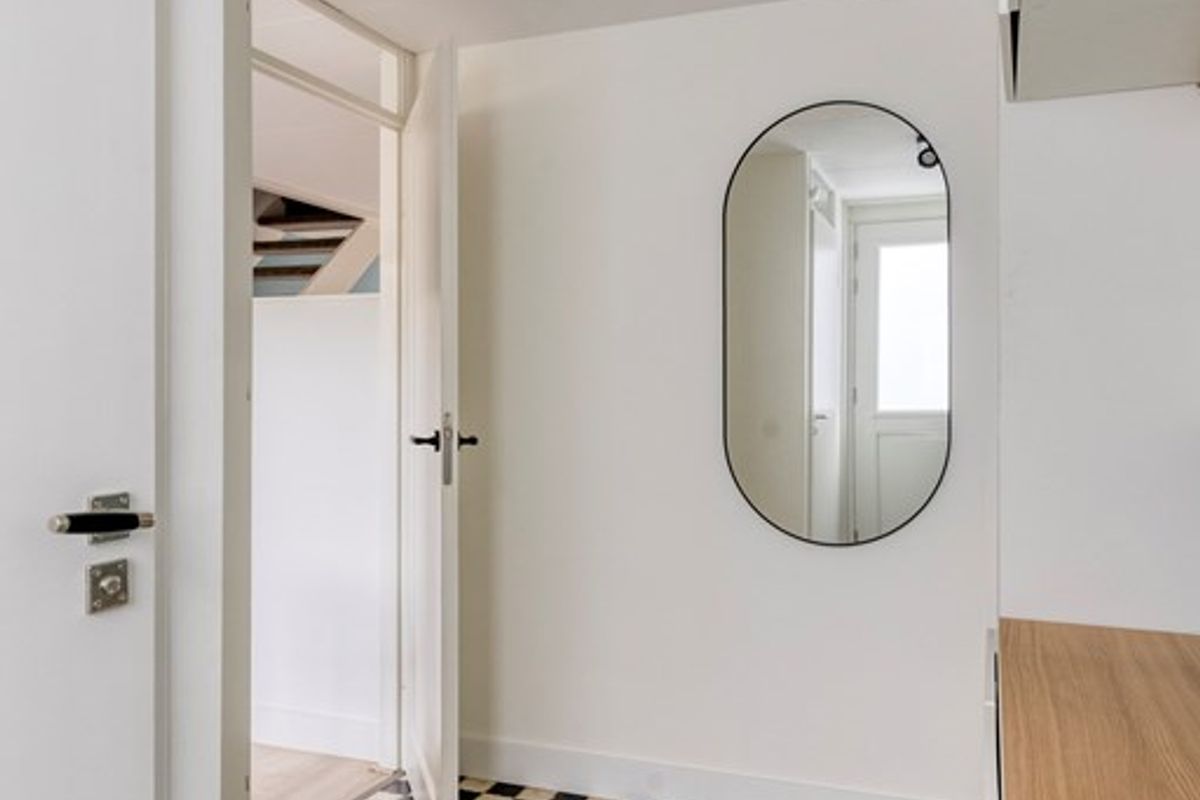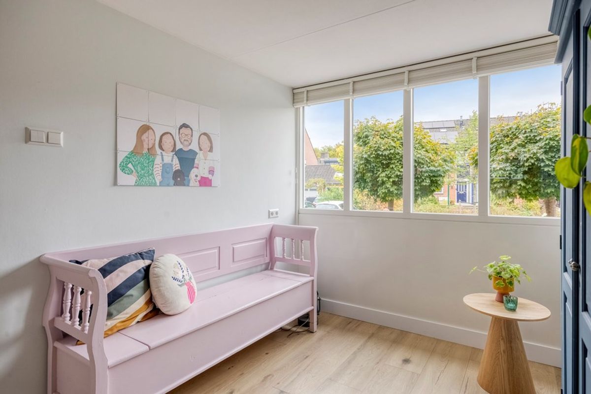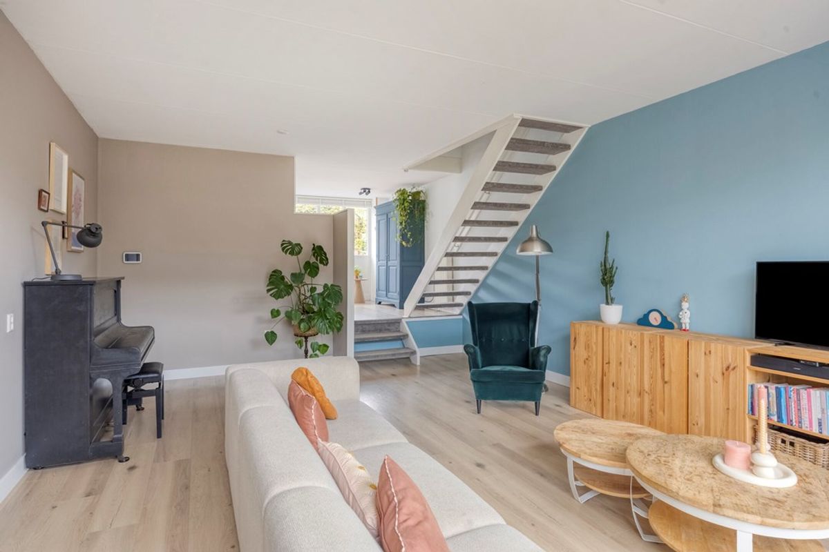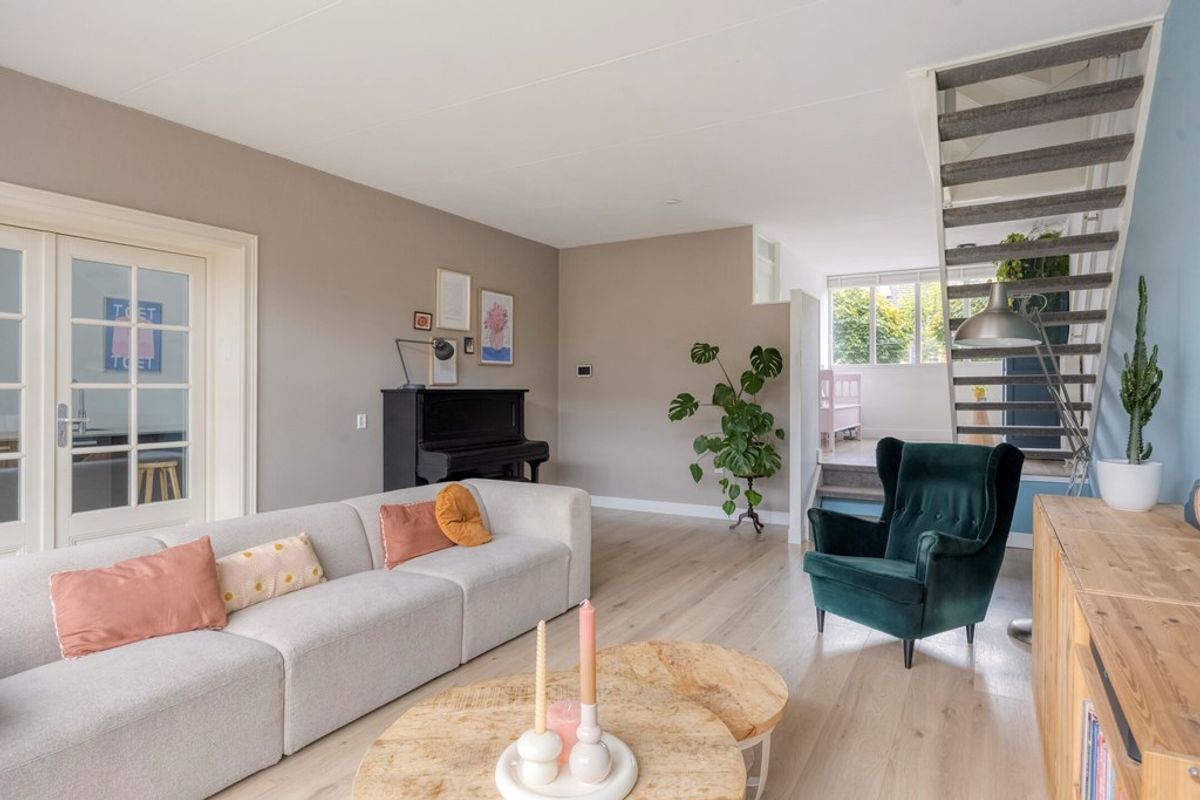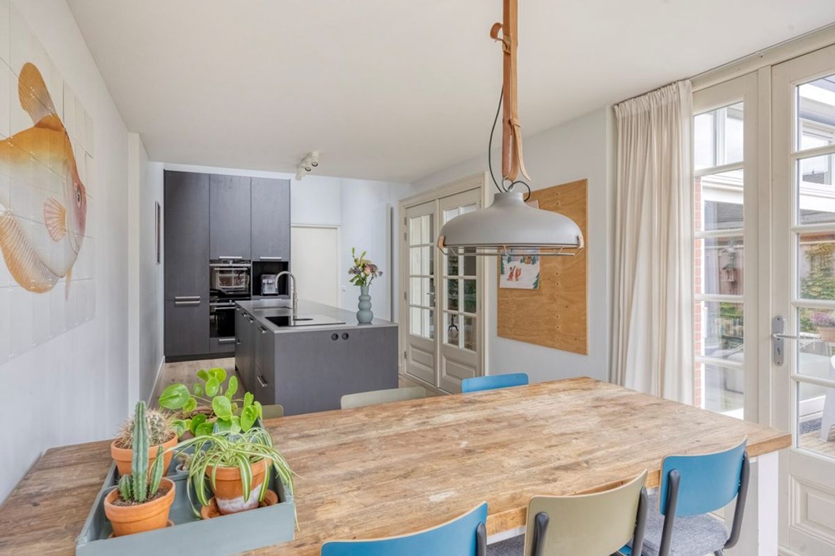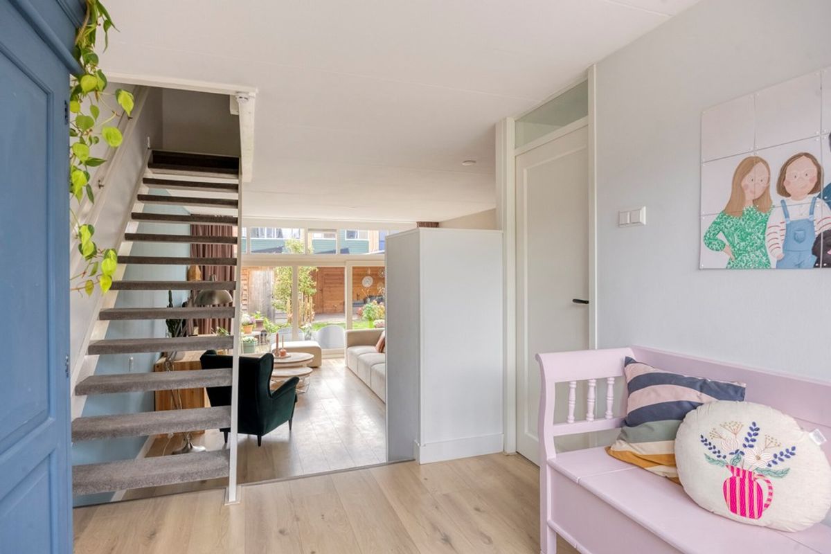 Via de verzorgde voortuin bereikt u de verhoogde entree. De hal met zwarte-wit geblokte tegelvloer en modern toilet vormt een stijlvolle binnenkomer. Een open opkamer voert u richting de woonkamer die enkele treden lager ligt: een lichte, sfeervolle ruimte met grote raampartijen en een schuifpui naar de tuin. De afwerking is modern en warm tegelijk, met een lichte vloer, zachte tinten en oog voor detail.