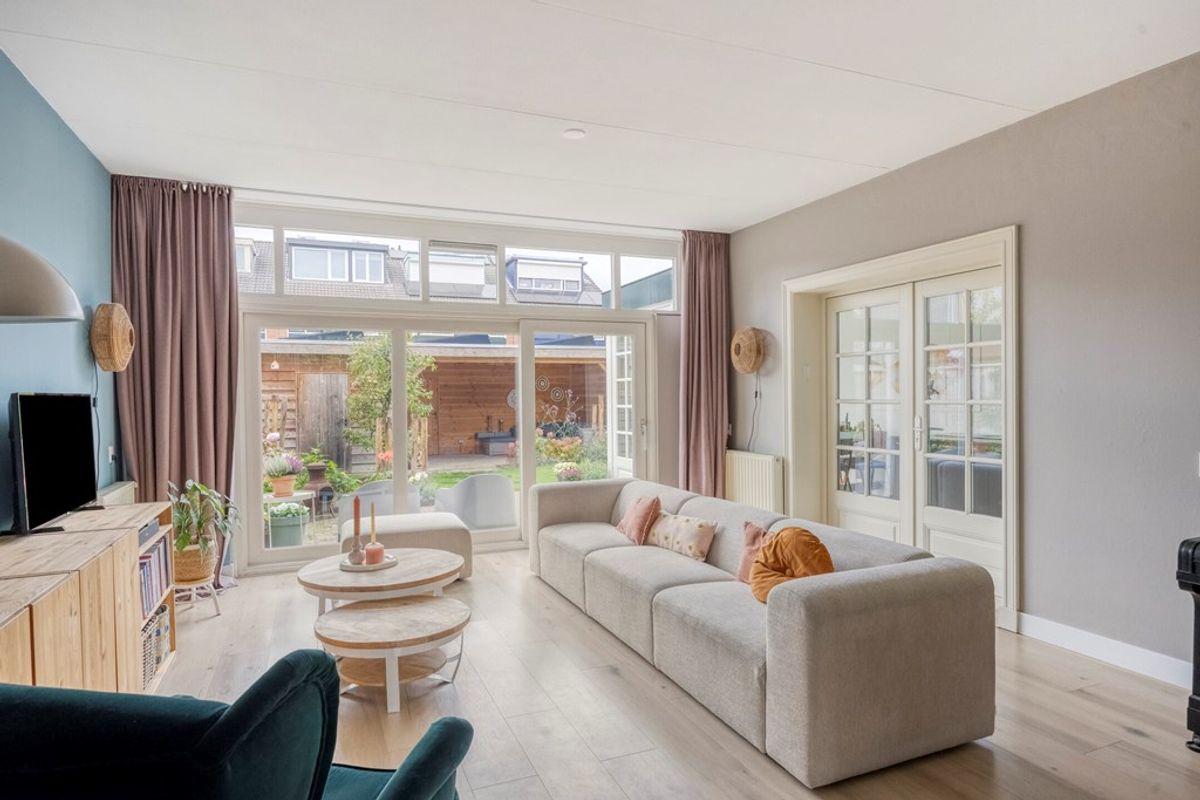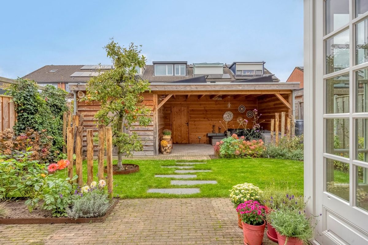 De achtertuin is een oase van rust en gezelligheid. Direct achter de woning ligt een ruim terras, perfect voor een ochtendkoffie in de zon. Het gazon met sierbeplanting en de appelboom zorgt voor een groene sfeer, terwijl de houten veranda achter in de tuin uitnodigt tot ontspannen avonden in de buitenlucht. Hier kunt u beschut loungen, barbecueën of met vrienden genieten van lange zomeravonden. De tuin is bovendien voorzien van een berging en een achterom. Aan de voorzijde is ruimte om op eigen terrein te parkeren.