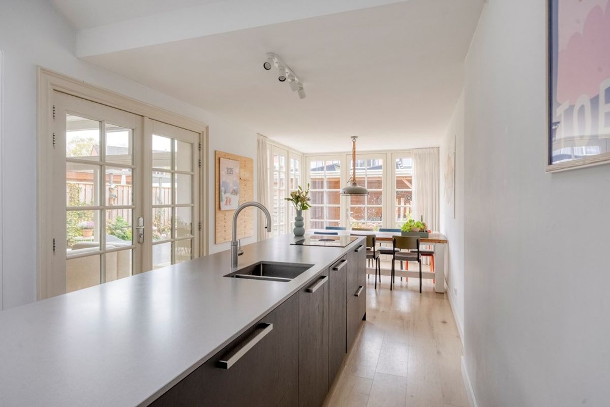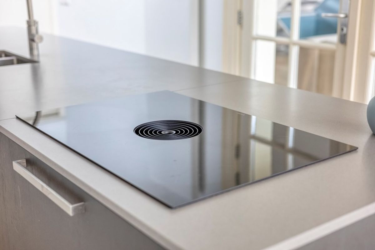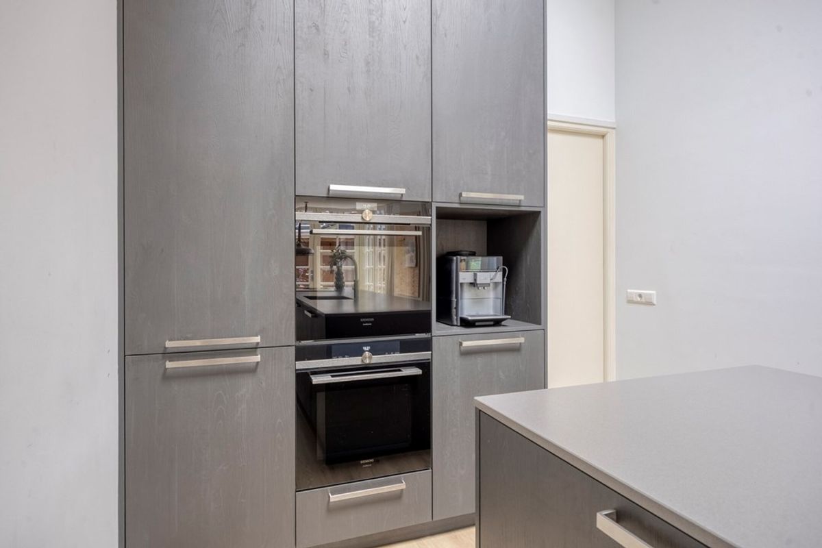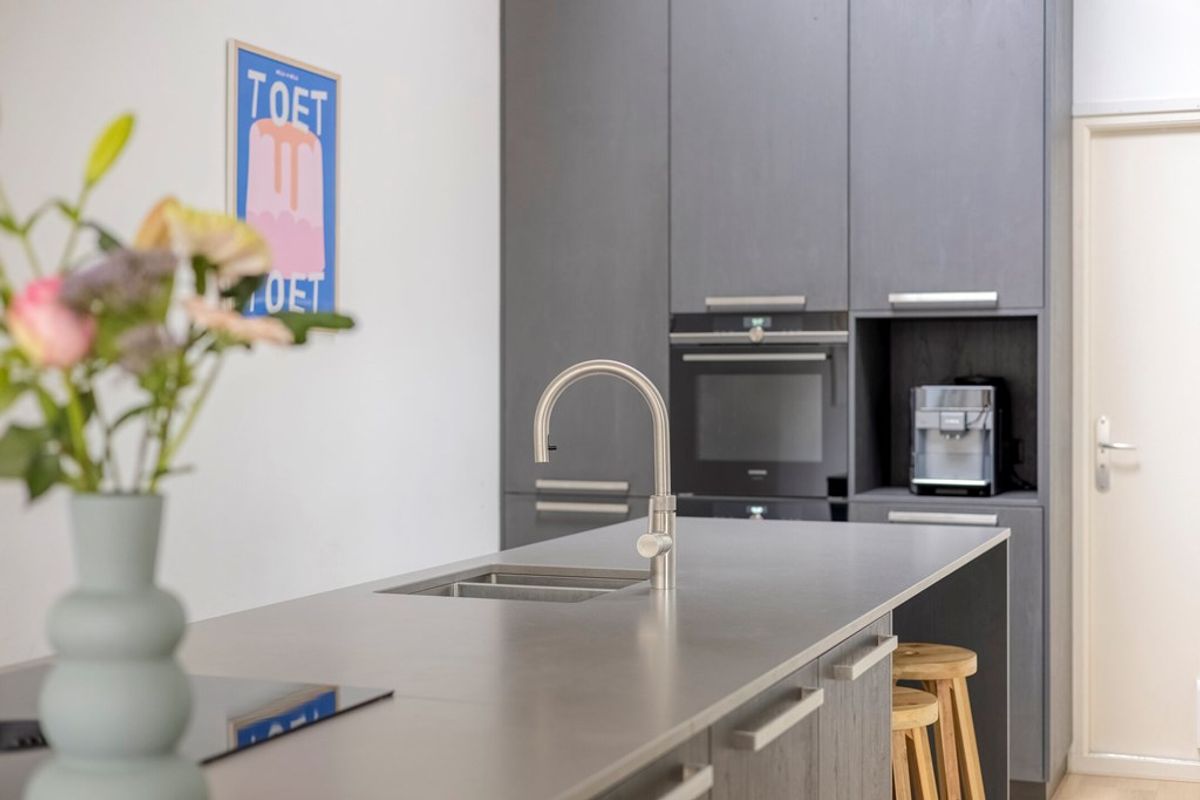 Een dubbele deur wijst u de leefkeuken – een absolute blikvanger. Het strakke kookeiland met composiet werkblad en geïntegreerde apparatuur, zoals een inductiekookplaat met geïntegreerde afzuiging, dubbele combi-oven, Quooker, vaatwasser en koel-/vriescombinatie, maakt koken hier een plezier. De eetruimte, omringd door een imposante raampartij met openslaande deuren, vormt een heerlijke plek voor lange avonden met familie en vrienden. De aangrenzende berging/bijkeuken biedt extra bergruimte en een praktische opstelling voor wasapparatuur.
