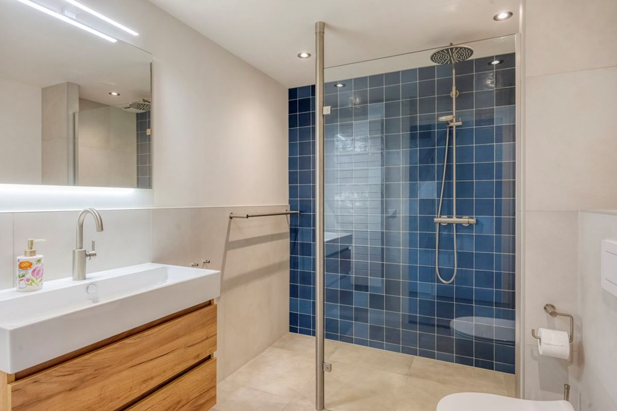 De eerste verdieping telt twee ruime slaapkamers , beide met veel licht en een verzorgde afwerking. De hoofdslaapkamer is bijzonder royaal en voorzien van een grote, op maat gemaakte kastenwand over de volledige breedte. De tweede kamer aan de voorzijde is ingericht als slaapkamer en werkplek, maar kan ook eenvoudig opgesplitst worden tot 2 slaapkamers. De badkamer is stijlvol en modern, met natuurlijke materialen, een inloopdouche met regendouchekop, hangkast, wandcloset, een houtlook wastafelmeubel en een strak betegelde afwerking.
