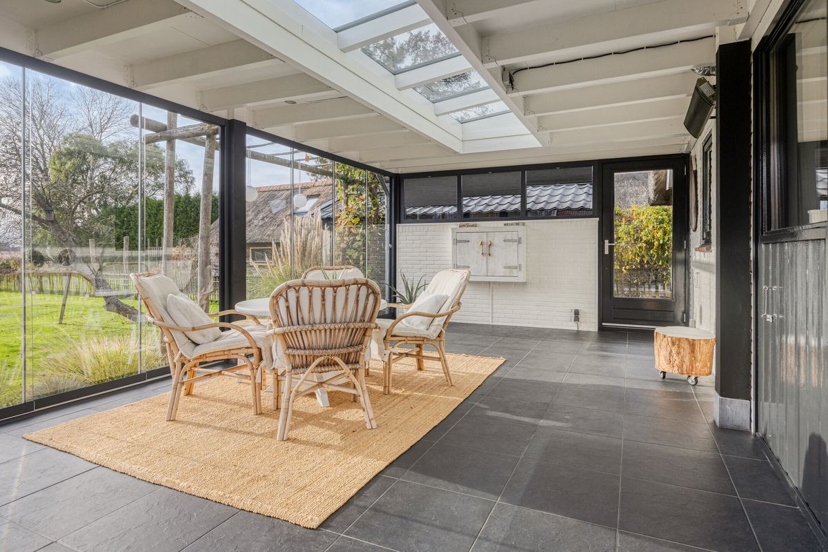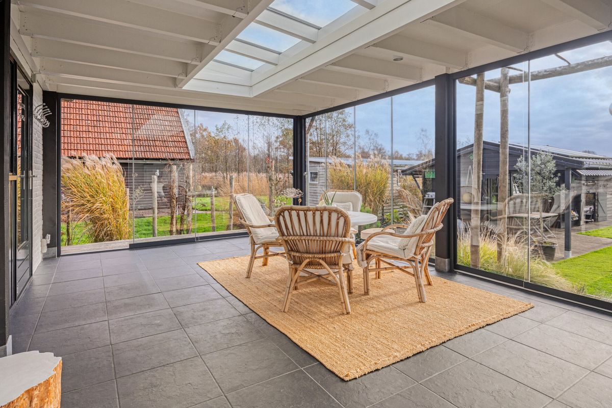 De diepe achtertuin beschikt over een mooi uitzicht over het water en de rietvelden, veel groen, diverse terrassen, een houten berging met overdekt terras, een botenhuis voor een punter en een berging. Naast de serre is er een berging/garage voor de elektrische micro-car.