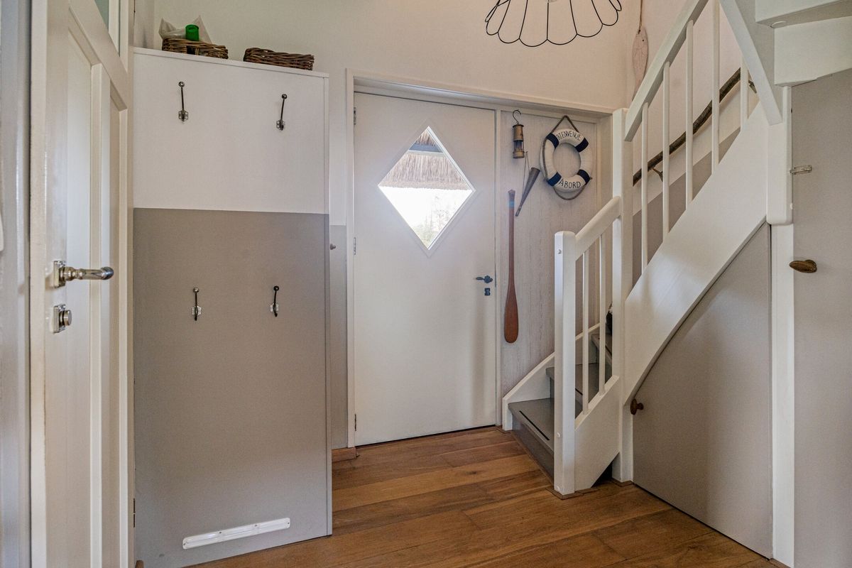 Overdekte entree / hal met trapopgang, kelder en een badkamer voorzien van een douchehoek, toilet en wastafel. De ruime woonkamer beschikt over veel lichtinval, houtkachel (ter overname) en mooi uitzicht over het vaarwater en de tuin. De keuken, gelegen aan de achterzijde is voorzien van een keukenblok met inbouwapparatuur, o.a. een keramische kookplaat, afzuigkap, combimagnetron, vaatwasser, koelkast en een vrieskast. De serre, bereikbaar via de woonkamer, is heerlijk ruim en licht en heeft een tuindeur en schuiframen.