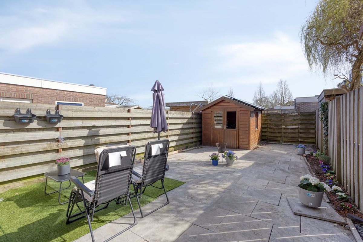 De onderhoudsvrije achtertuin is zo’n 13 diep en ligt op het zonnige zuidoosten. In de smalle border aan de rechterkant kunt u nog wat groen planten. Achter in de tuin staat een houten tuinhuis. De tuin beschikt over een achterom met dubbele schuttingdeur. De schuttingen aan weerszijden zijn netjes en kunnen nog jaren mee!