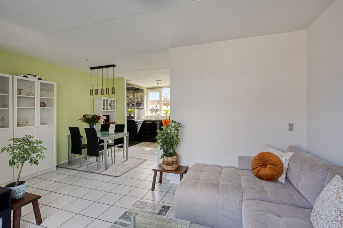 Lichte nette living met een witte tegelvloer. Leuke knusse zithoek aan de voorzijde met uitzicht op de ruime straat. Halverwege heeft u mooi de ruimte om uw eethoek te plaatsen.