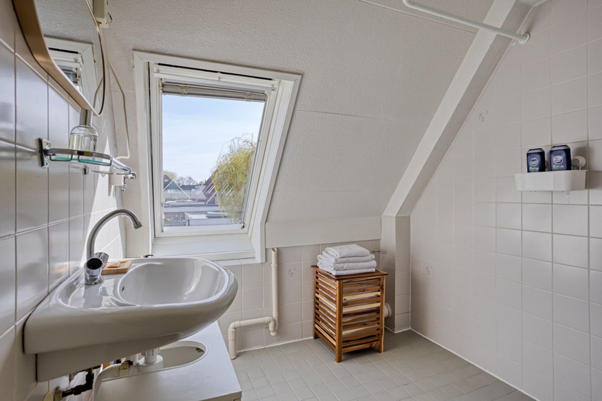 Prima badkamer met ook hier een groot Velux dakraam (HR++ beglazing 2025!) voor lucht, licht en natuurlijke ventilatie. Ruime inloopdouche en verder een wastafel met onderkastje, planchet en spiegel en een radiator.