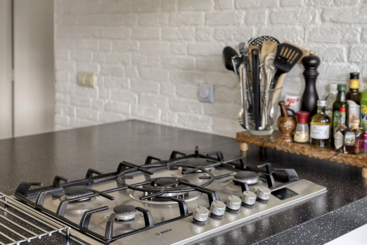 * Luxe keuken voorzien van plavuizen vloer, kookeiland met 5-pits gaskookplaat en afzuigkap, daarnaast is er een combi-oven/magnetron, koel-/vriescombinatie en vaatwasser.