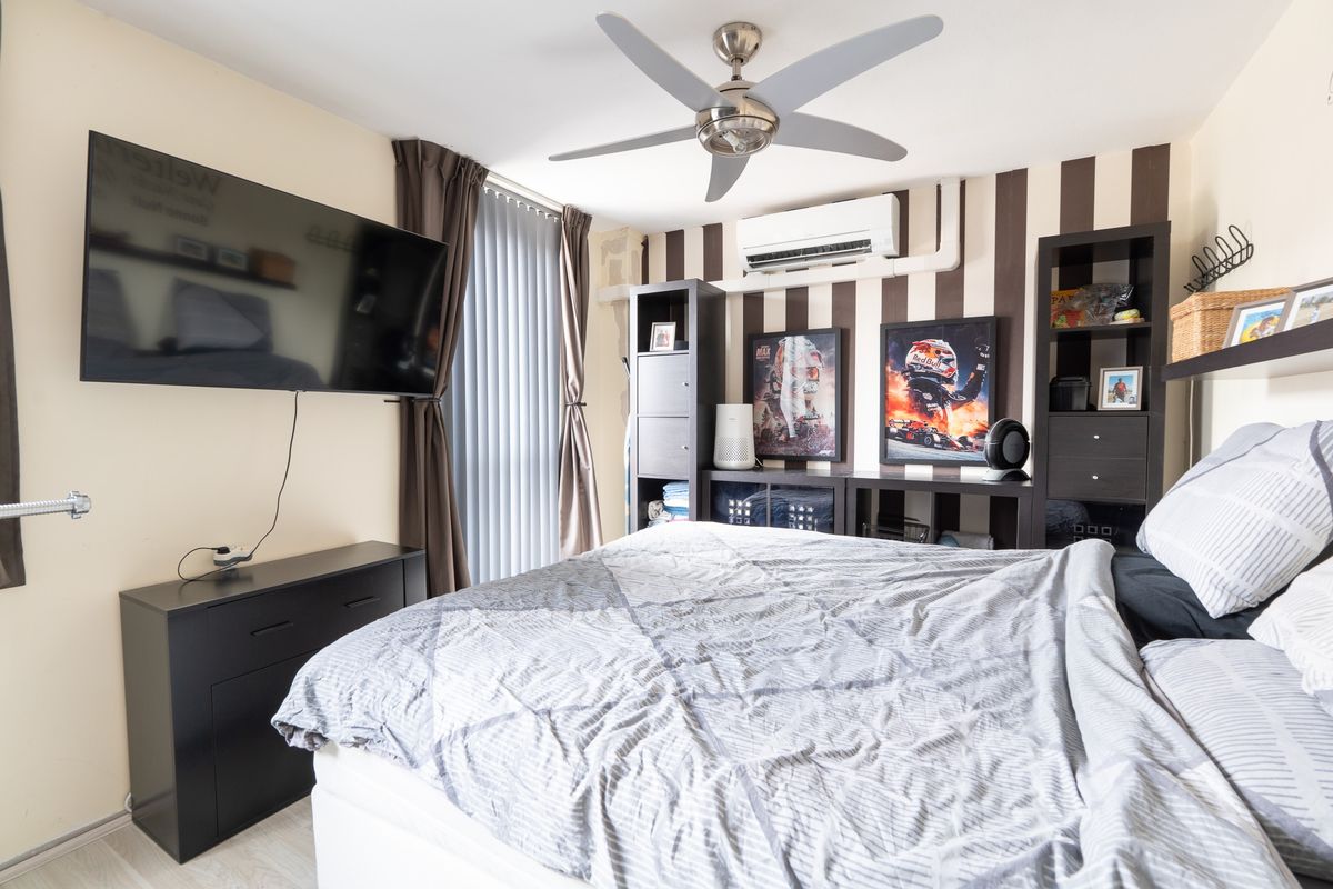 De trap naar de eerste verdieping is gestoffeerd, wat zorgt voor een zachte en geluidsdempende overgang naar de slaapvertrekken. Op de gehele verdieping ligt een nette laminaatvloer. U vindt hier twee slaapkamers en een badkamer. De grote slaapkamer aan de achterzijde van de woning heeft toegang tot een charmant balkon. Beide slaapkamers zijn uitgerust met een airco-unit en een inzet hor voor het raam, waardoor u altijd kunt genieten van een comfortabel binnenklimaat en een ongestoorde nachtrust.