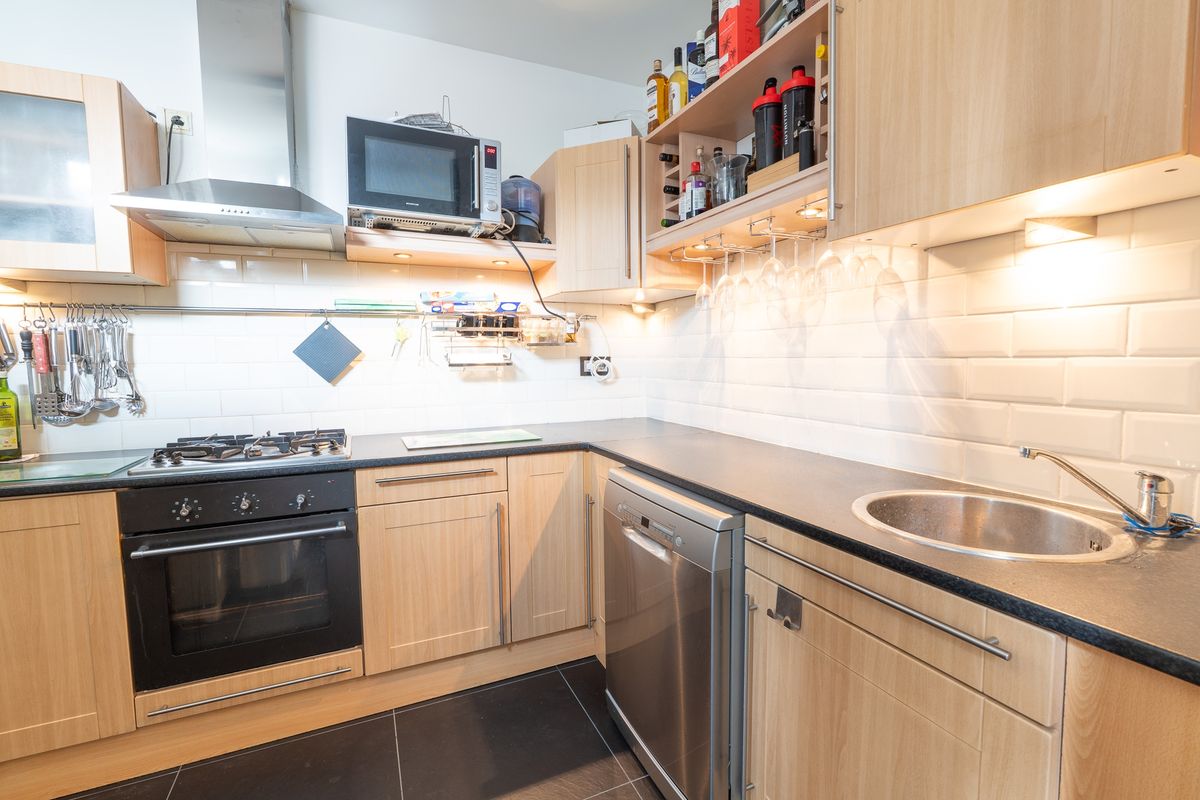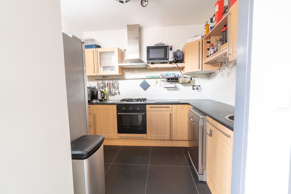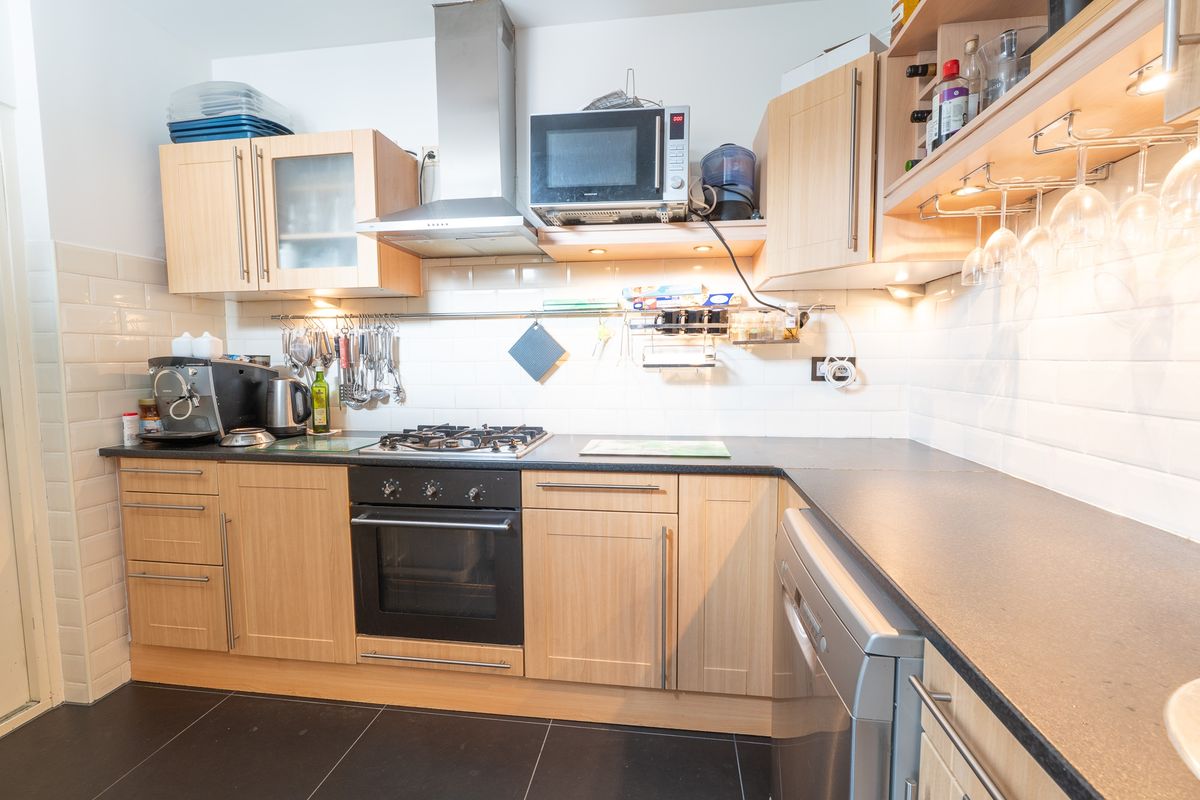 De keuken, met zijn doorlopende tegelvloer, is praktisch en staat in open verbinding met de woonkamer. De aanwezige berging is een bijzonder pluspunt van deze woning; in tegenstelling tot de gebruikelijke aanbouw is deze voorzien van een stevige betonvloer. Dit biedt een perfecte basis voor de wasmachine- en drogeropstelling. Daarnaast is er een wasbak met koudwateraansluiting en zijn de wanden geïsoleerd en afgewerkt met gipsplaten. De omvormer voor de zonnepanelen op de berging is hier ook netjes weggewerkt.