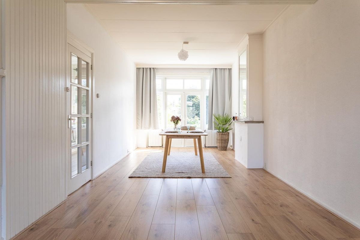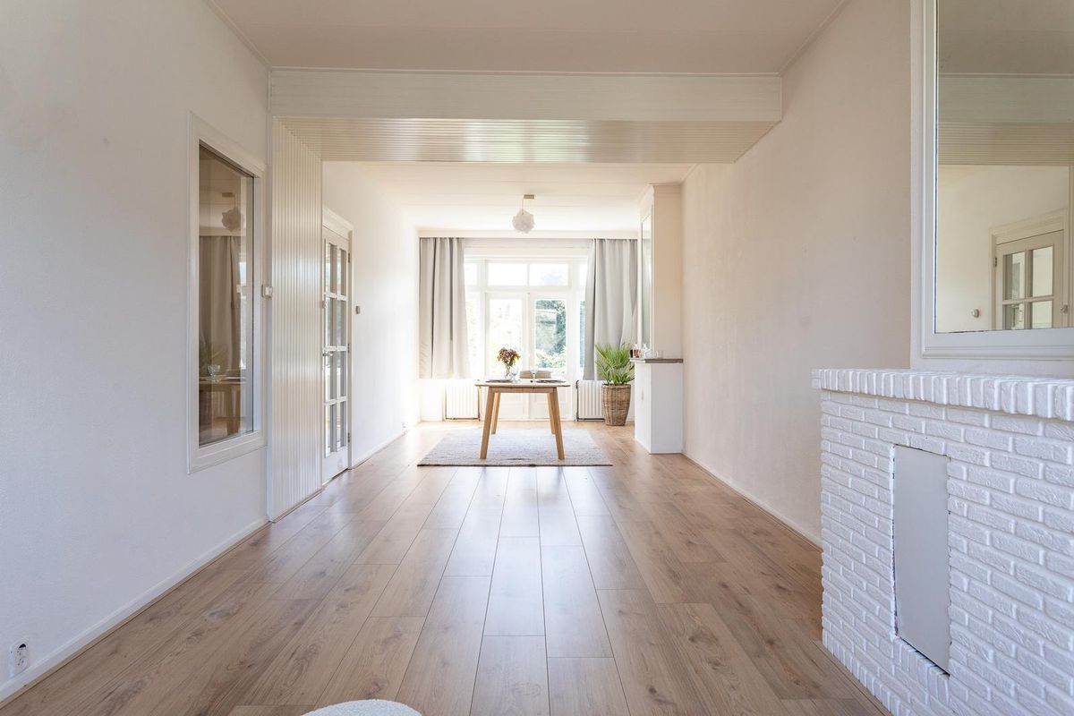 Entree woning, ruime entreehal met toegang tot ieder vertrek. Over de volle lengte van de woning strekt zich de royale en lichte woon-/eetkamer met aan de voorzijde de woonkamer en aan de achterzijde de eetkamer. Aan de voorzijde van de woning vind je de eerste slaapkamer welke van goed formaat is en beschikt over een inbouwkast. De achterzijkamer kan tevens worden gebruikt als slaapkamer en biedt voldoende ruimte. De keuken bevindt zich eveneens aan de achterzijde van de woning en is uitgevoerd in rechte opstelling. De keuken is voorzien van diverse inbouwapparatuur en biedt plaats voor de C.V.-combiketel. De badkamer bevindt zich naast de achterzijkamer en beschikt over een douche, wastafel en toilet.