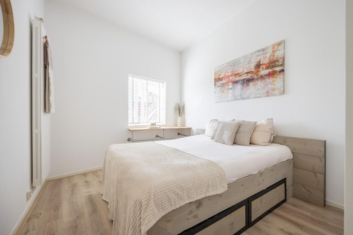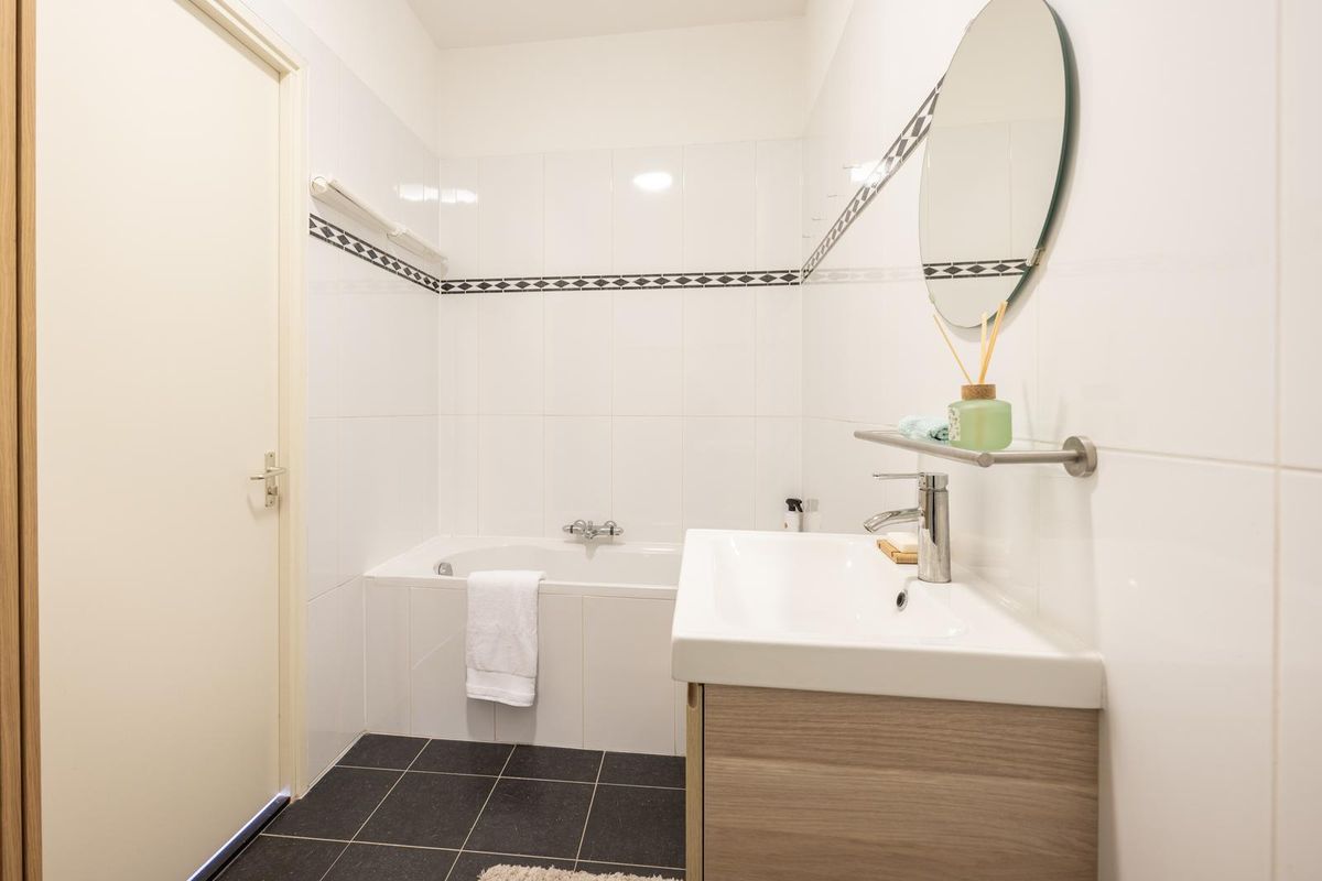 Vanuit de hal is er ook toegang tot de slaapkamer en badkamer. De ruime tweepersoonskamer straalt een aangename rust uit en de badkamer is ingedeeld met een ligbad, aparte douche en een wastafelmeubel.