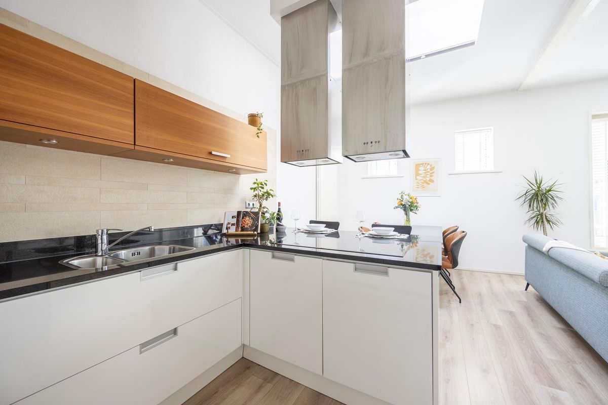 De woonkamer met open keuken is een fraaie, lichte en goed in te delen leefruimte met een lichtkoepel en grote ramen aan de zuidwestkant. Voor een heerlijke bank, een tv-meubel, de eettafel en je favoriete woonaccessoires is genoeg plek. In de keuken staat een kwalitatief goede opstelling aan vier zijden, met een granieten aanrechtblad en meer dan genoeg bergruimte. De inductie kookplaat, dubbele afzuigkap, vaatwasser, twee combi-ovens, koffiemachine, koelkast en vriezer zijn ingebouwd.