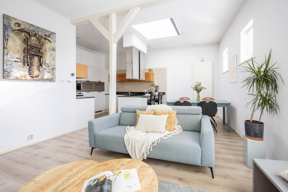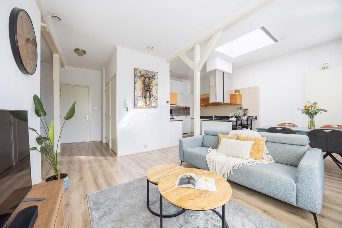 Je stapt de ruime hal in, die in open verbinding met de woonkamer staat. De laminaatvloer ligt in bijna het hele appartement en wat opvalt is het circa 3 meter hoge plafond, waardoor het appartement een loftachtige uitstraling heeft. Links in de hal zijn de toiletruimte met fonteintje en een berging, waar de wasmachine en eventuele droger kunnen staan.